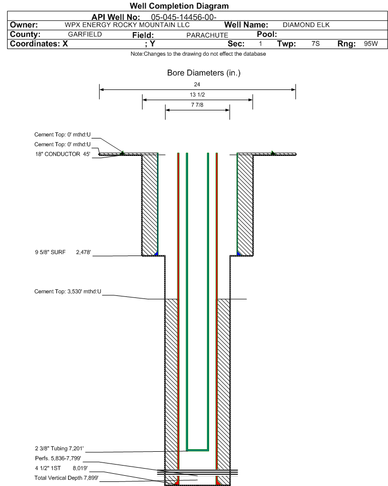 | Wellbore Completed | | Completion Date: | 9/7/2008 | | Spud Date: | 8/26/2008 | Spud Date Is: | ACTUAL | | Measured TD: | 8041 ft. | Measured PB depth: | 7991 ft. | | True Vertical TD: | 7899 ft. | True Vertical PB depth: | 7849 ft. | | Top PZ Location: | Sec:1 Twp: 7S 95W | Footage: 976 FSL 736 FWL | | Bottom Hole Location: | Sec:1 Twp: 7S 95W | Footage: 976 FSL 736 FWL | | Log Types: | CBL; RESERVOIR MONITOR TOOL ELITE | | Casing: | String Type: CONDUCTOR, Hole Size: 24 in., Size: 18 in., Top: 0 ft., Depth: 45 ft., Weight: , Citings Type: ACTUAL | | Cement: | Sacks: 25, Top: 0 ft., Bottom: 45 ft., Determination Method: CALC | | Casing: | String Type: SURF, Hole Size: 13.5 in., Size: 9.625 in., Top: 0 ft., Depth: 2478 ft., Weight: , Citings Type: ACTUAL | | Cement: | Sacks: 545, Top: 0 ft., Bottom: 2478 ft., Determination Method: CALC | | Casing: | String Type: 1ST, Hole Size: 7.875 in., Size: 4.5 in., Top: 0 ft., Depth: 8019 ft., Weight: , Citings Type: ACTUAL | | Cement: | Sacks: 930, Top: 3530 ft., Bottom: 8019 ft., Determination Method: CBL | | Formation | Interval Top | Log Bottom | Cored | DSTs | | WASATCH G | 2280 ft. | | N | N | | MESAVERDE | 4553 ft. | | N | N | | CAMEO | 6951 ft. | | N | N | | ROLLINS | 7879 ft. | | N | N |