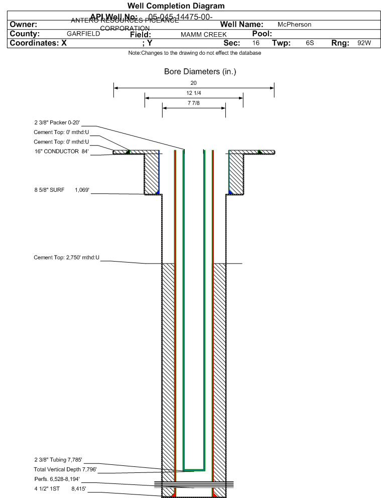 Wellbore #00 Wellbore Classification: GW Status: PR - 5/22/2012 Measured TD: 8425 ft. Vertical TD: 7796 ft.| Wellbore Data for Original Wellbore | Wellbore Classification: GW PR - 5/22/2012 | | Wellbore Permit | DIRECTIONAL | | Permit #: | | Expiration Date: | 5/30/2013 | | Proposed Top PZ Location: | Sec:16 Twp: 6S 92W | Footage: 297 FNL 1223 FWL | | Bottom Hole Location: | Sec:16 Twp: 6S 92W | Footage: 297 FNL 1223 FWL | | Proposed Depth/Form: | 7754 ft. | | Surface Mineral Owner Same: | No | | Mineral Owner: | FEE | Surface Owner: | FEE | | Unit: | | Unit Number: | | | Formation And Spacing: | Code: ILES , Formation: ILES , Order: 191-25 , Unit Acreage: 320, Drill Unit: S/2 | | Formation And Spacing: | Code: WMFK , Formation: WILLIAMS FORK , Order: 523-2 , Unit Acreage: 320, Drill Unit: S/2 | | Casing: | String Type: CONDUCTOR, Hole Size: 24 in., Size: 16 in., Top: 0 ft., Depth: 60 ft., Weight: 55# , Citings Type: PLANNED | | Cement: | Sacks: 177, Top: 0 ft., Bottom: 60 ft. | | Casing: | String Type: SURF, Hole Size: 12.25 in., Size: 8.625 in., Top: 0 ft., Depth: 1000 ft., Weight: 24/32# , Citings Type: PLANNED | | Cement: | Sacks: 416, Top: 0 ft., Bottom: 1000 ft. | | Casing: | String Type: 1ST, Hole Size: 7.875 in., Size: 4.5 in., Top: 0 ft., Depth: 7754 ft., Weight: 11.6# , Citings Type: PLANNED | | Cement: | Sacks: 356, Top: , Bottom: 7754 ft. | | Casing: | String Type: 2ND, Hole Size: 7.875 in., Size: 5.5 in., Top: , Depth: 8541 ft., Weight: 17# , Citings Type: PLANNED | | Cement: | Sacks: 798, Top: 4066 ft., Bottom: 8541 ft. |