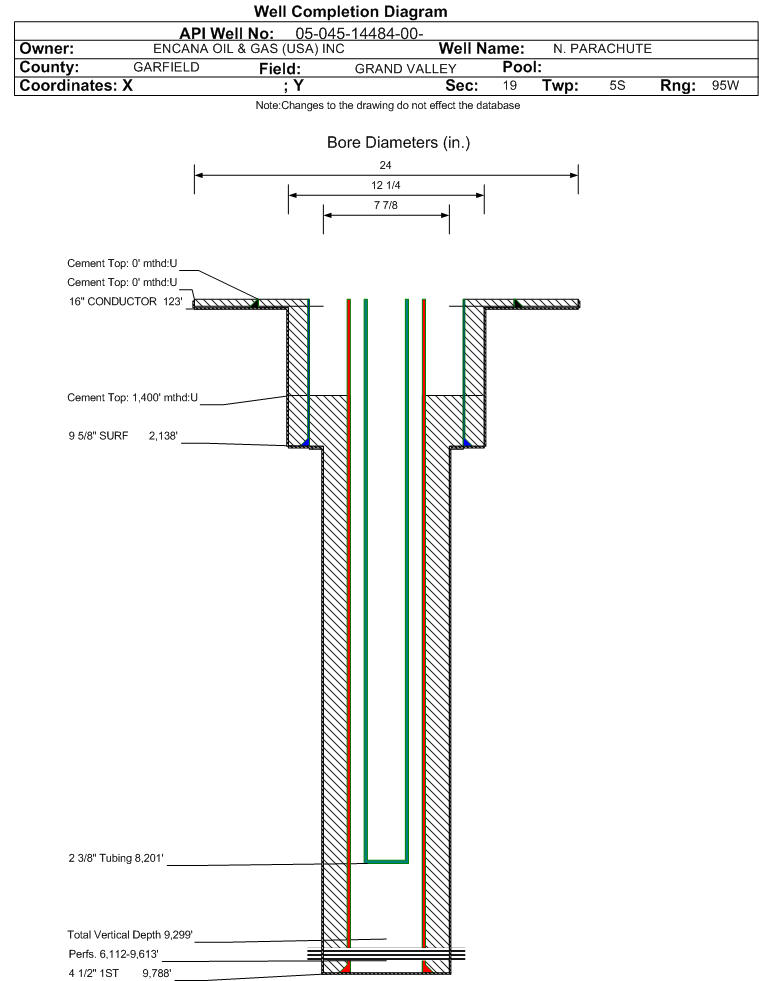 | Wellbore Completed | | Completion Date: | 6/17/2008 | | Spud Date: | 6/6/2008 | Spud Date Is: | ACTUAL | | Measured TD: | 9800 ft. | Measured PB depth: | 9744 ft. | | True Vertical TD: | 9299 ft. | True Vertical PB depth: | 9243 ft. | | Top PZ Location: | Sec:24 Twp: 5S 96W | Footage: 530 FNL 565 FEL | | Bottom Hole Location: | Sec:24 Twp: 5S 96W | Footage: 530 FNL 565 FEL | | Log Types: | CBL, MUD | | Casing: | String Type: CONDUCTOR, Hole Size: 24 in., Size: 16 in., Top: 0 ft., Depth: 123 ft., Weight: , Citings Type: ACTUAL | | Cement: | Sacks: 400, Top: 0 ft., Bottom: 100 ft., Determination Method: CALC | | Casing: | String Type: SURF, Hole Size: 12.25 in., Size: 9.625 in., Top: 0 ft., Depth: 2138 ft., Weight: , Citings Type: ACTUAL | | Cement: | Sacks: 475, Top: 0 ft., Bottom: 2180 ft., Determination Method: CALC | | Casing: | String Type: 1ST, Hole Size: 7.875 in., Size: 4.5 in., Top: 0 ft., Depth: 9788 ft., Weight: , Citings Type: ACTUAL | | Cement: | Sacks: 1285, Top: 1400 ft., Bottom: 9800 ft., Determination Method: CBL | | Formation | Interval Top | Log Bottom | Cored | DSTs | | WILLIAMS FORK | 6059 ft. | 9789 ft. | N | N | | ROLLINS | 9789 ft. | 9800 ft. | N | N |