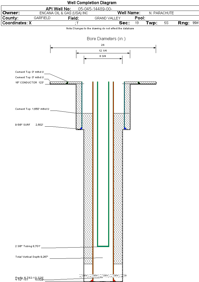 | Wellbore Completed | | Completion Date: | 1/17/2008 | | Spud Date: | 10/13/2007 | Spud Date Is: | ACTUAL | | Measured TD: | 10540 ft. | Measured PB depth: | 10477 ft. | | True Vertical TD: | 9267 ft. | True Vertical PB depth: | 9204 ft. | | Top PZ Location: | Sec:24 Twp: 5S 96W | Footage: 1883 FSL 2023 FEL | | Bottom Hole Location: | Sec:24 Twp: 5S 96W | Footage: 1883 FSL 2023 FEL | | Log Types: | CBL, MUD | | Casing: | String Type: CONDUCTOR, Hole Size: 24 in., Size: 16 in., Top: 0 ft., Depth: 123 ft., Weight: , Citings Type: ACTUAL | | Cement: | Sacks: , Top: 0 ft., Bottom: 112 ft., Determination Method: CALC | | Casing: | String Type: SURF, Hole Size: 12.25 in., Size: 9.625 in., Top: 0 ft., Depth: 2502 ft., Weight: , Citings Type: ACTUAL | | Cement: | Sacks: 500, Top: 0 ft., Bottom: 2502 ft., Determination Method: CALC | | Casing: | String Type: 1ST, Hole Size: 8.75 in., Size: 4.5 in., Top: 0 ft., Depth: 10522 ft., Weight: , Citings Type: ACTUAL | | Cement: | Sacks: 1598, Top: 1650 ft., Bottom: 9606 ft., Determination Method: CBL | | Formation | Interval Top | Log Bottom | Cored | DSTs | | WILLIAMS FORK | 6735 ft. | 10412 ft. | N | N | | ROLLINS | 10412 ft. | 10540 ft. | N | N |