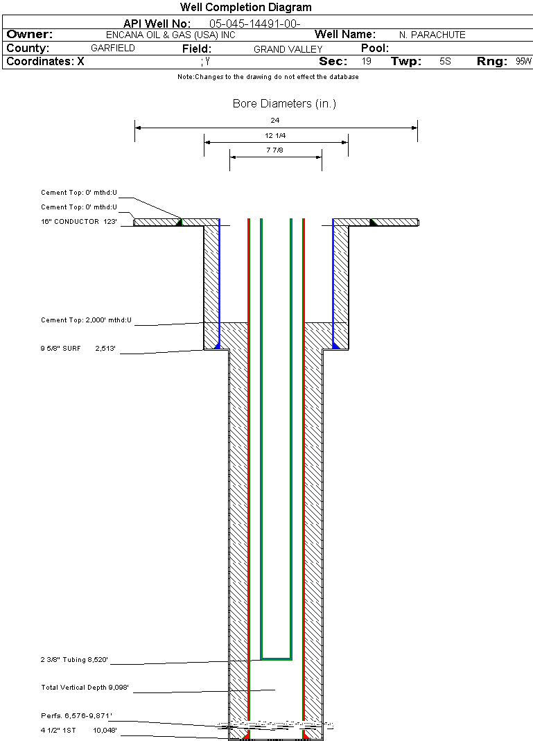 | Wellbore Completed | | Completion Date: | 3/31/2008 | | Spud Date: | 12/10/2007 | Spud Date Is: | ACTUAL | | Measured TD: | 10215 ft. | Measured PB depth: | 10001 ft. | | True Vertical TD: | 9098 ft. | True Vertical PB depth: | 8884 ft. | | Top PZ Location: | Sec:24 Twp: 5S 96W | Footage: 2504 FSL 1920 FEL | | Bottom Hole Location: | Sec:24 Twp: 5S 96W | Footage: 2504 FSL 1920 FEL | | Log Types: | CBL, MUD | | Casing: | String Type: CONDUCTOR, Hole Size: 24 in., Size: 16 in., Top: 0 ft., Depth: 123 ft., Weight: , Citings Type: ACTUAL | | Cement: | Sacks: 450, Top: 0 ft., Bottom: 123 ft., Determination Method: CALC | | Casing: | String Type: SURF, Hole Size: 12.25 in., Size: 9.625 in., Top: 0 ft., Depth: 2513 ft., Weight: , Citings Type: ACTUAL | | Cement: | Sacks: 520, Top: 0 ft., Bottom: 2534 ft., Determination Method: CALC | | Casing: | String Type: 1ST, Hole Size: 7.875 in., Size: 4.5 in., Top: 0 ft., Depth: 10048 ft., Weight: , Citings Type: ACTUAL | | Cement: | Sacks: 1903, Top: 2000 ft., Bottom: 10050 ft., Determination Method: CBL | | Formation | Interval Top | Log Bottom | Cored | DSTs | | WILLIAMS FORK | 6449 ft. | 10227 ft. | N | N |
