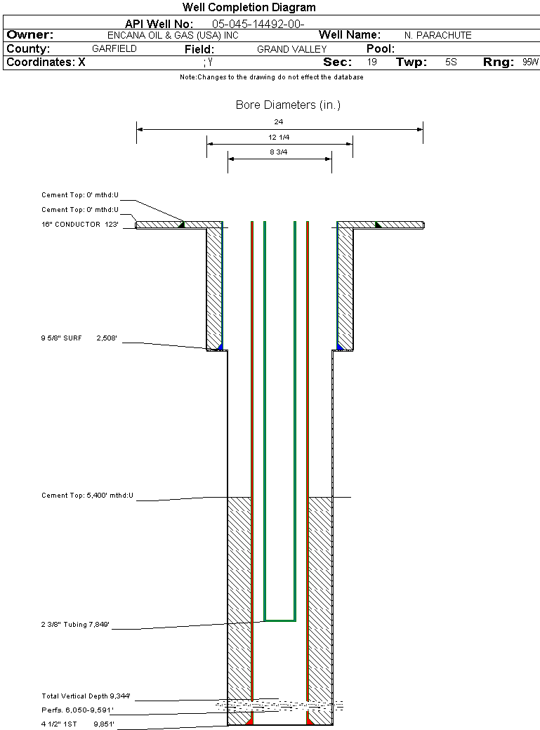 | Wellbore Completed | | Completion Date: | 2/13/2008 | | Spud Date: | 12/17/2007 | Spud Date Is: | ACTUAL | | Measured TD: | 9871 ft. | Measured PB depth: | 9805 ft. | | True Vertical TD: | 9344 ft. | True Vertical PB depth: | 9278 ft. | | Top PZ Location: | Sec:24 Twp: 5S 96W | Footage: 2505 FSL 605 FEL | | Bottom Hole Location: | Sec:24 Twp: 5S 96W | Footage: 2505 FSL 605 FEL | | Log Types: | CBL, MUD | | Casing: | String Type: CONDUCTOR, Hole Size: 24 in., Size: 16 in., Top: 0 ft., Depth: 123 ft., Weight: , Citings Type: ACTUAL | | Cement: | Sacks: 400, Top: 0 ft., Bottom: 123 ft., Determination Method: CALC | | Casing: | String Type: SURF, Hole Size: 12.25 in., Size: 9.625 in., Top: 0 ft., Depth: 2508 ft., Weight: , Citings Type: ACTUAL | | Cement: | Sacks: 480, Top: 0 ft., Bottom: 2525 ft., Determination Method: CALC | | Casing: | String Type: 1ST, Hole Size: 8.75 in., Size: 4.5 in., Top: 0 ft., Depth: 9851 ft., Weight: , Citings Type: ACTUAL | | Cement: | Sacks: 1328, Top: 5400 ft., Bottom: 9851 ft., Determination Method: CBL | | Formation | Interval Top | Log Bottom | Cored | DSTs | | WILLIAMS FORK | 5977 ft. | 9677 ft. | N | N | | ROLLINS | 9677 ft. | 9871 ft. | N | N |