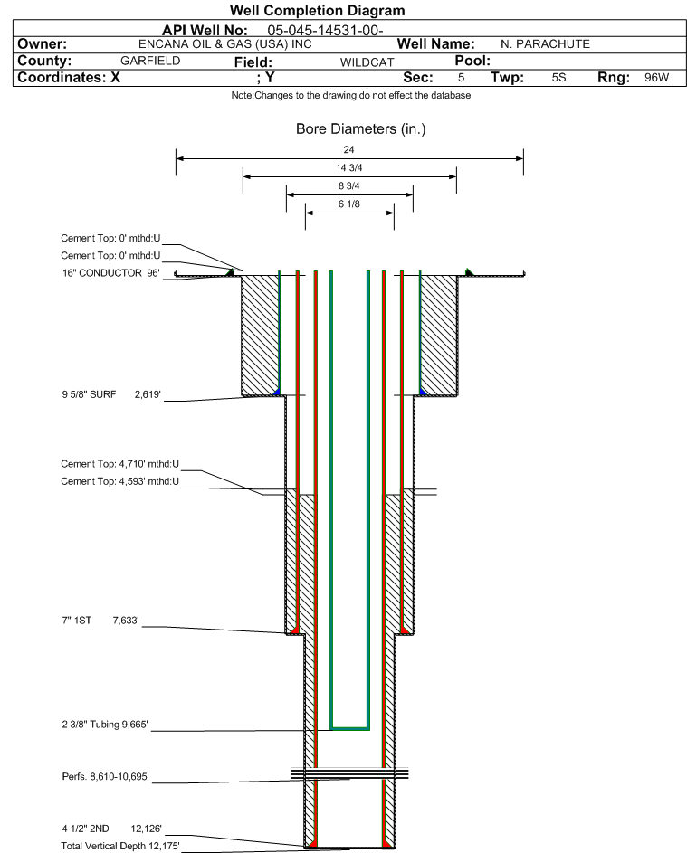 Wellbore #00 Wellbore Classification: GW Status: PR - 2/1/2021 Measured TD: 12198 ft. Vertical TD: 12175 ft.| Wellbore Data for Original Wellbore | Wellbore Classification: GW PR - 2/1/2021 | | Wellbore Permit | DIRECTIONAL | | Permit #: | 20073347 | Expiration Date: | 8/9/2008 | | Proposed Top PZ Location: | Sec: Twp: | Footage: 330 FNL 330 FEL | | Bottom Hole Location: | Sec:5 Twp: 5S 96W | Footage: 330 FNL 330 FEL | | Proposed Depth/Form: | 12038 ft. | | Surface Mineral Owner Same: | Yes | | Mineral Owner: | FEE | Surface Owner: | FEE | | Unit: | | Unit Number: | | | Formation And Spacing: | Code: WMFK , Formation: WILLIAMS FORK , Order: 510-13 , Unit Acreage: , Drill Unit: | | Casing: | String Type: CONDUCTOR, Hole Size: 26 in., Size: 16 in., Top: , Depth: 80 ft., Weight: , Citings Type: PLANNED | | Cement: | Sacks: , Top: 0 ft., Bottom: 80 ft. | | Casing: | String Type: SURF, Hole Size: 14.75 in., Size: 9.625 in., Top: , Depth: 2000 ft., Weight: 36 , Citings Type: PLANNED | | Cement: | Sacks: 926, Top: 0 ft., Bottom: 2000 ft. | | Casing: | String Type: 1ST, Hole Size: 8.75 in., Size: 4.5 in., Top: , Depth: 12033 ft., Weight: 11.6 , Citings Type: PLANNED | | Cement: | Sacks: 1247, Top: , Bottom: 12033 ft. |