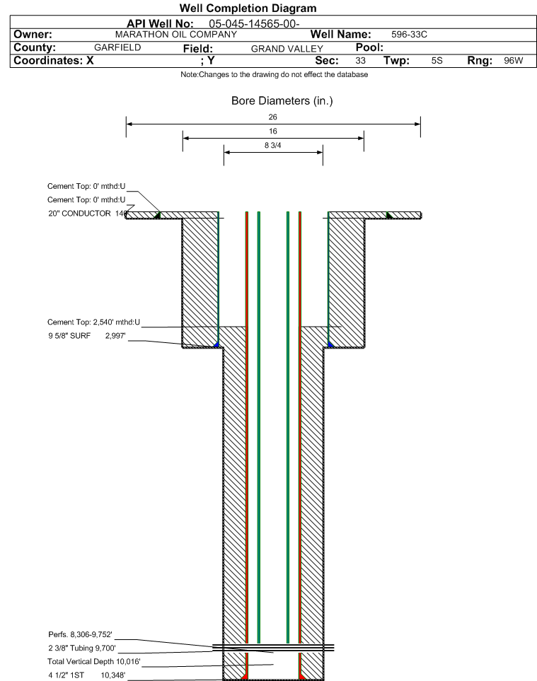 | Wellbore Completed | | Completion Date: | 10/1/2008 | | Spud Date: | 6/5/2008 | Spud Date Is: | ACTUAL | | Measured TD: | 10370 ft. | Measured PB depth: | 10281 ft. | | True Vertical TD: | 10016 ft. | True Vertical PB depth: | 9928 ft. | | Top PZ Location: | Sec:33 Twp: 5S 96W | Footage: 2157 FSL 700 FWL | | Bottom Hole Location: | Sec:33 Twp: 5S 96W | Footage: 2093 FSL 515 FWL | | Log Types: | NO LOGS RUN YET AND NO FORMATION TPS YET. AS DRILLED BHL AND TOP OF PROD. ZONE NOT YET CALCULATED | | Log Types: | | | Log Types: | DIGITAL ACOUSTILOG GAMMA RAY, RADIAL ANALYSIS BOND LONG, RESEVOIR PERFORMACE MONITOR | | Log Types: | DIGITAL ACOUSTILOG GAMMA RAY, RADIAL ANALYSIS BOND LOGS, RESERVOIR PERFORMANCE MONITOR | | Casing: | String Type: CONDUCTOR, Hole Size: 26 in., Size: 20 in., Top: 0 ft., Depth: 140 ft., Weight: , Citings Type: ACTUAL | | Cement: | Sacks: , Top: 0 ft., Bottom: , Determination Method: | | Casing: | String Type: SURF, Hole Size: 16 in., Size: 9.625 in., Top: 0 ft., Depth: 2997 ft., Weight: , Citings Type: ACTUAL | | Cement: | Sacks: 1424, Top: 0 ft., Bottom: 2997 ft., Determination Method: CALC | | Casing: | String Type: 1ST, Hole Size: 8.75 in., Size: 4.5 in., Top: 0 ft., Depth: 10348 ft., Weight: , Citings Type: ACTUAL | | Cement: | Sacks: 831, Top: 2540 ft., Bottom: 10348 ft., Determination Method: CBL | | Formation | Interval Top | Log Bottom | Cored | DSTs | | WASATCH G | 5060 ft. | | N | N | | FORT UNION | 5405 ft. | | N | N | | MESAVERDE | 6979 ft. | | N | N | | CAMEO | 9570 ft. | | N | N | | ROLLINS | 10093 ft. | | N | N |
