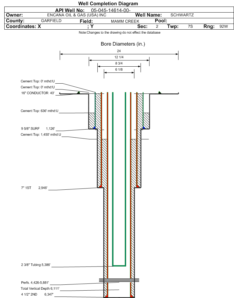 | Wellbore Completed | | Completion Date: | 11/24/2007 | | Spud Date: | 11/7/2007 | Spud Date Is: | ACTUAL | | Measured TD: | 6365 ft. | Measured PB depth: | 6198 ft. | | True Vertical TD: | 6111 ft. | True Vertical PB depth: | | | Top PZ Location: | Sec:2 Twp: 7S 92W | Footage: 1177 FSL 1989 FWL | | Bottom Hole Location: | Sec:2 Twp: 7S 92W | Footage: 1177 FSL 1989 FWL | | Log Types: | RST, CBL, PNDL | | Casing: | String Type: CONDUCTOR, Hole Size: , Size: , Top: 0 ft., Depth: 40 ft., Weight: 42# , Citings Type: ACTUAL | | Cement: | Sacks: 80, Top: 0 ft., Bottom: 40 ft., Determination Method: VISU | | Casing: | String Type: SURF, Hole Size: 12.25 in., Size: 9.625 in., Top: 0 ft., Depth: 1126 ft., Weight: 36# , Citings Type: ACTUAL | | Cement: | Sacks: 584, Top: 0 ft., Bottom: 1160 ft., Determination Method: VISU | | Casing: | String Type: 1ST, Hole Size: 8.75 in., Size: , Top: 0 ft., Depth: 2946 ft., Weight: 23# , Citings Type: ACTUAL | | Cement: | Sacks: 227, Top: 0 ft., Bottom: 2946 ft., Determination Method: VISU | | Casing: | String Type: 2ND, Hole Size: 6.25 in., Size: 4.5 in., Top: 0 ft., Depth: 6347 ft., Weight: 11.6# , Citings Type: ACTUAL | | Cement: | Sacks: 476, Top: 1450 ft., Bottom: 6347 ft., Determination Method: CBL | | Formation | Interval Top | Log Bottom | Cored | DSTs | | WASATCH | 0 ft. | 3489 ft. | N | N | | WILLIAMS FORK | 3490 ft. | 6365 ft. | N | N |