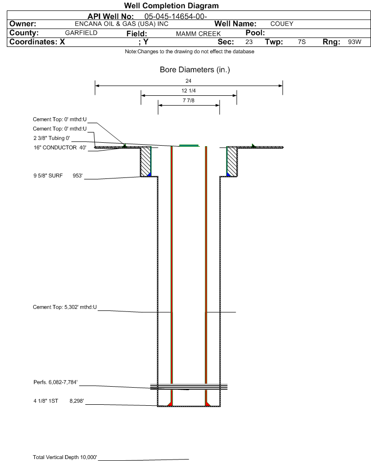 | Wellbore Completed | | Completion Date: | N/A | | Spud Date: | 12/16/2007 | Spud Date Is: | ACTUAL | | Measured TD: | 8318 ft. | Measured PB depth: | | | True Vertical TD: | | True Vertical PB depth: | | | Top PZ Location: | Sec:24 Twp: 7S 93W | Footage: 1917 FSL 688 FWL | | Bottom Hole Location: | Sec:24 Twp: 7S 93W | Footage: 1917 FSL 688 FWL | | Log Types: | ACOUSTIC CEMENT, CBL | | Log Types: | | | Casing: | String Type: CONDUCTOR, Hole Size: , Size: , Top: 0 ft., Depth: 40 ft., Weight: 42 , Citings Type: ACTUAL | | Cement: | Sacks: 235, Top: 0 ft., Bottom: 40 ft., Determination Method: VISU | | Casing: | String Type: SURF, Hole Size: 12.25 in., Size: 9.625 in., Top: 0 ft., Depth: 953 ft., Weight: 36 , Citings Type: ACTUAL | | Cement: | Sacks: 520, Top: 0 ft., Bottom: 953 ft., Determination Method: VISU | | Casing: | String Type: 1ST, Hole Size: 7.875 in., Size: 4.5 in., Top: 0 ft., Depth: 8298 ft., Weight: 11.60 , Citings Type: ACTUAL | | Cement: | Sacks: 560, Top: 5302 ft., Bottom: 8298 ft., Determination Method: CBL | | Formation | Interval Top | Log Bottom | Cored | DSTs | | WASATCH | 0 ft. | 5180 ft. | N | N | | WILLIAMS FORK | 5181 ft. | 8199 ft. | N | N | | ROLLINS | 8200 ft. | | N | N |