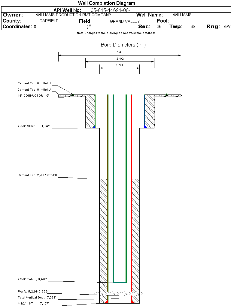 | Wellbore Completed | | Completion Date: | 12/3/2007 | | Spud Date: | 11/24/2007 | Spud Date Is: | ACTUAL | | Measured TD: | 7189 ft. | Measured PB depth: | 7140 ft. | | True Vertical TD: | 7023 ft. | True Vertical PB depth: | 6974 ft. | | Top PZ Location: | Sec:36 Twp: 6S 96W | Footage: 1837 FSL 490 FEL | | Bottom Hole Location: | Sec:36 Twp: 6S 96W | Footage: 1837 FSL 490 FEL | | Log Types: | CBL; HIGH RES.INDUCTION/SPECTRAL DENSITY/DUAL SPACED NEUTRON; MUD | | Casing: | String Type: CONDUCTOR, Hole Size: 24 in., Size: 18 in., Top: 0 ft., Depth: 45 ft., Weight: , Citings Type: ACTUAL | | Cement: | Sacks: 25, Top: 0 ft., Bottom: 45 ft., Determination Method: CALC | | Casing: | String Type: SURF, Hole Size: 13.5 in., Size: 9.625 in., Top: 0 ft., Depth: 1141 ft., Weight: 32.3 , Citings Type: ACTUAL | | Cement: | Sacks: 325, Top: 0 ft., Bottom: 1141 ft., Determination Method: CALC | | Casing: | String Type: 1ST, Hole Size: 7.875 in., Size: 4.5 in., Top: 0 ft., Depth: 7167 ft., Weight: 11.6 , Citings Type: ACTUAL | | Cement: | Sacks: 861, Top: 2900 ft., Bottom: 7167 ft., Determination Method: CBL | | Formation | Interval Top | Log Bottom | Cored | DSTs | | WASATCH G | 2047 ft. | | N | N | | MESAVERDE | 3970 ft. | | N | N | | CAMEO | 6548 ft. | | N | N | | ROLLINS | 7069 ft. | | N | N |