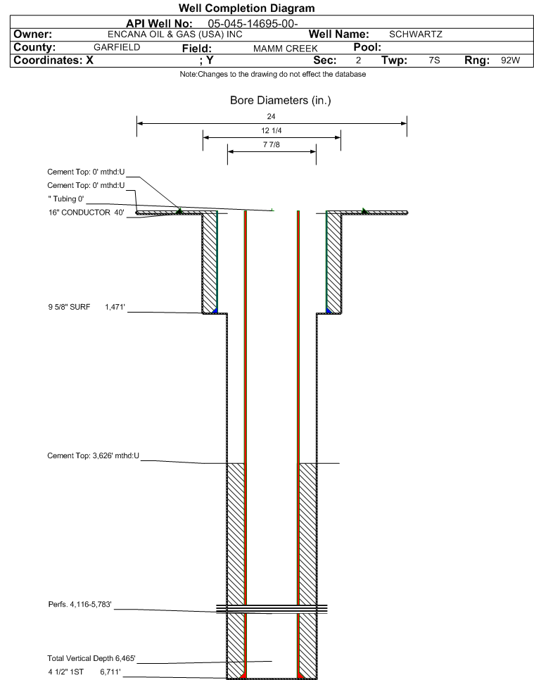 | | Perforation Data: | | Interval Top: | 4116 ft. | # Of Holes: | 104 | | Interval Bottom: | 5783 ft. | Hole Size: | 0.36 in. |