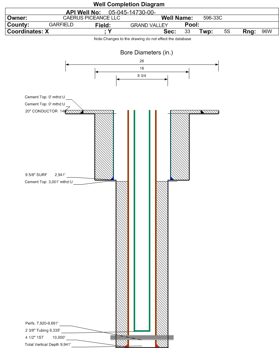 | Wellbore Completed | | Completion Date: | 10/23/2008 | | Spud Date: | 6/22/2008 | Spud Date Is: | ACTUAL | | Measured TD: | 10020 ft. | Measured PB depth: | 9962 ft. | | True Vertical TD: | 9941 ft. | True Vertical PB depth: | 9884 ft. | | Top PZ Location: | Sec:33 Twp: 5S 96W | Footage: 565 FSL 2027 FWL | | Bottom Hole Location: | Sec:33 Twp: 5S 96W | Footage: 555 FSL 2049 FWL | | Log Types: | DIGITAL ACOUSTILOG/GR, RADIAL ANALYSIS BOND, RESER. PERF. MONITOR; MUD | | Log Types: | NO LOGS RUN YET AND NO FORMATION TOPS YET. AS-DRILLED BHL AND TOP OF PROD. ZONE NOT YET CALCULATED | | Log Types: | NO LOGS YET | | Casing: | String Type: CONDUCTOR, Hole Size: 26 in., Size: 20 in., Top: 0 ft., Depth: 140 ft., Weight: 53 , Citings Type: ACTUAL | | Cement: | Sacks: 0, Top: 0 ft., Bottom: 140 ft., Determination Method: CALC | | Casing: | String Type: SURF, Hole Size: 16 in., Size: 9.625 in., Top: 0 ft., Depth: 2941 ft., Weight: 36 , Citings Type: ACTUAL | | Cement: | Sacks: 1424, Top: 0 ft., Bottom: 2941 ft., Determination Method: CALC | | Casing: | String Type: 1ST, Hole Size: 8.75 in., Size: 4.5 in., Top: 0 ft., Depth: 10000 ft., Weight: 11.6 , Citings Type: ACTUAL | | Cement: | Sacks: 789, Top: 3001 ft., Bottom: 10000 ft., Determination Method: CBL | | Formation | Interval Top | Log Bottom | Cored | DSTs | | WASATCH G | 4926 ft. | | N | N | | FORT UNION | 5262 ft. | | N | N | | MESAVERDE | 6678 ft. | | N | N | | CAMEO | 9325 ft. | | N | N | | ROLLINS | 9829 ft. | | N | N |