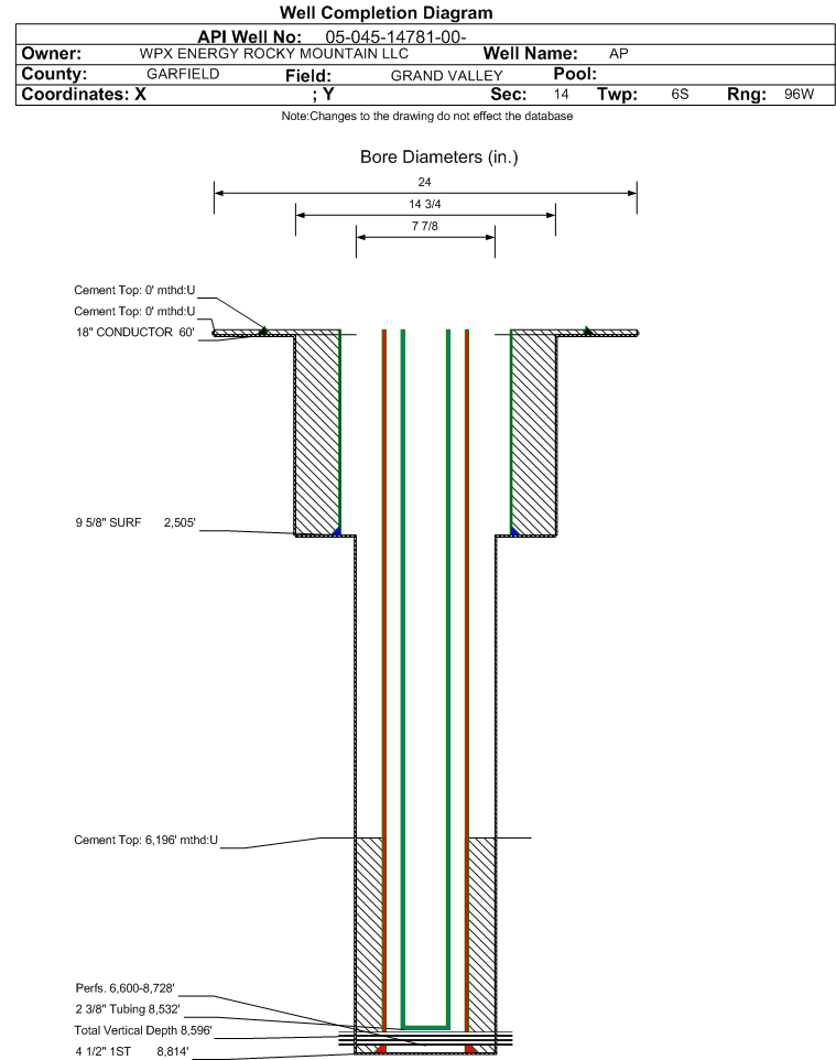 Wellbore #00 Wellbore Classification: GW Status: PR - 6/24/2010 Measured TD: 8938 ft. Vertical TD: 8596 ft.| Wellbore Data for Original Wellbore | Wellbore Classification: GW PR - 6/24/2010 | | Wellbore Permit | DIRECTIONAL | | Permit #: | 20086357 | Expiration Date: | 11/12/2009 | | Proposed Top PZ Location: | Sec: Twp: | Footage: 120 FSL 1935 FWL | | Bottom Hole Location: | Sec:14 Twp: 6S 96W | Footage: 120 FSL 1935 FWL | | Proposed Depth/Form: | 8807 ft. | | Surface Mineral Owner Same: | Yes | | Mineral Owner: | FEE | Surface Owner: | FEE | | Unit: | | Unit Number: | | | Formation And Spacing: | Code: WMFK , Formation: WILLIAMS FORK , Order: 479-14 , Unit Acreage: 320, Drill Unit: N/2 |