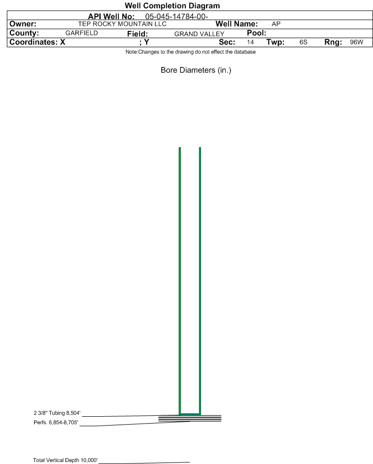 Wellbore #00 Wellbore Classification: GW Status: PR - 8/1/2023 Measured TD: 8852 ft. Vertical TD: 8852 ft.| Wellbore Data for Original Wellbore | Wellbore Classification: GW PR - 8/1/2023 | | Wellbore Permit | DIRECTIONAL | | Permit #: | 20074162 | Expiration Date: | 10/3/2008 | | Proposed Top PZ Location: | Sec: Twp: | Footage: 736 FSL 443 FEL | | Bottom Hole Location: | Sec:14 Twp: 6S 96W | Footage: 736 FSL 443 FEL | | Proposed Depth/Form: | 8856 ft. | | Surface Mineral Owner Same: | Yes | | Mineral Owner: | FEE | Surface Owner: | FEE | | Unit: | | Unit Number: | | | Formation And Spacing: | Code: WMFK , Formation: WILLIAMS FORK , Order: 510-12 , Unit Acreage: , Drill Unit: S/2 | | Casing: | String Type: CONDUCTOR, Hole Size: 22 in., Size: 18 in., Top: , Depth: 60 ft., Weight: , Citings Type: PLANNED | | Cement: | Sacks: , Top: 0 ft., Bottom: 60 ft. | | Casing: | String Type: SURF, Hole Size: 14.75 in., Size: 9.625 in., Top: , Depth: 1122 ft., Weight: 32.3 , Citings Type: PLANNED | | Cement: | Sacks: , Top: 0 ft., Bottom: 1119 ft. | | Casing: | String Type: 1ST, Hole Size: 7.875 in., Size: 4.5 in., Top: , Depth: 8856 ft., Weight: 11.6 , Citings Type: PLANNED | | Cement: | Sacks: , Top: 200 ft., Bottom: |
