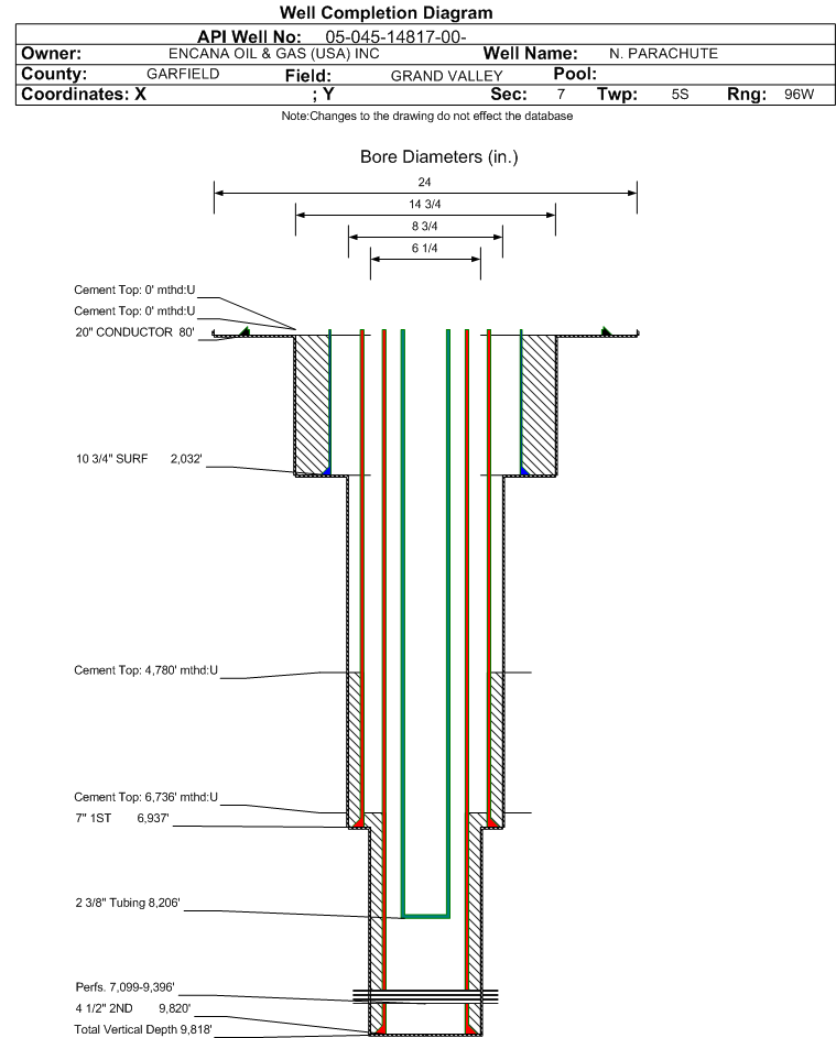 | Wellbore Completed | | Completion Date: | 7/25/2008 | | Spud Date: | 12/3/2007 | Spud Date Is: | ACTUAL | | Measured TD: | 9830 ft. | Measured PB depth: | 9754 ft. | | True Vertical TD: | 9818 ft. | True Vertical PB depth: | 9741 ft. | | Top PZ Location: | Sec:7 Twp: 5S 96W | Footage: 374 FSL 1447 FWL | | Bottom Hole Location: | Sec:7 Twp: 5S 96W | Footage: 374 FSL 1447 FWL | | Log Types: | USIT (2), GR, MUD (2), CBL (2) | | Casing: | String Type: CONDUCTOR, Hole Size: 24 in., Size: 20 in., Top: 0 ft., Depth: 80 ft., Weight: , Citings Type: ACTUAL | | Cement: | Sacks: , Top: 0 ft., Bottom: 80 ft., Determination Method: | | Casing: | String Type: SURF, Hole Size: 14.75 in., Size: 10.75 in., Top: 0 ft., Depth: 2032 ft., Weight: 40.5 , Citings Type: ACTUAL | | Cement: | Sacks: 2844, Top: 0 ft., Bottom: 2032 ft., Determination Method: | | Casing: | String Type: 1ST, Hole Size: 8.75 in., Size: 7 in., Top: 0 ft., Depth: 6937 ft., Weight: 23 , Citings Type: ACTUAL | | Cement: | Sacks: 1180, Top: 4780 ft., Bottom: 6937 ft., Determination Method: CBL | | Casing: | String Type: 2ND, Hole Size: 6.25 in., Size: 4.5 in., Top: 0 ft., Depth: 9820 ft., Weight: 11.6 , Citings Type: ACTUAL | | Cement: | Sacks: 270, Top: 6736 ft., Bottom: 9820 ft., Determination Method: CBL | | Formation | Interval Top | Log Bottom | Cored | DSTs | | WASATCH A | 2311 ft. | | N | N | | WASATCH | 4766 ft. | | N | N | | OHIO CREEK | 5993 ft. | | N | N | | WILLIAMS FORK | 6448 ft. | | N | N | | CAMEO | 9030 ft. | | N | N | | ROLLINS | 9570 ft. | | N | N |