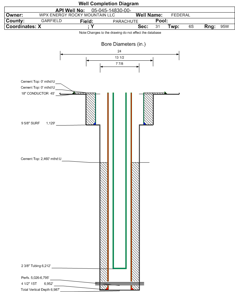 Wellbore #00 Wellbore Classification: GW Status: PR - 10/31/2008 Measured TD: 6995 ft. Vertical TD: 6987 ft.| Wellbore Data for Original Wellbore | Wellbore Classification: GW PR - 10/31/2008 | | Wellbore Permit | DIRECTIONAL | | Permit #: | 20074629 | Expiration Date: | 10/16/2008 | | Proposed Top PZ Location: | Sec: Twp: | Footage: 392 FSL 1141 FWL | | Bottom Hole Location: | Sec:31 Twp: 6S 95W | Footage: 392 FSL 1141 FWL | | Proposed Depth/Form: | 7076 ft. | | Surface Mineral Owner Same: | Yes | | Mineral Owner: | FEDERAL | Surface Owner: | FEDERAL | | Unit: | | Unit Number: | | | Formation And Spacing: | Code: WMFK , Formation: WILLIAMS FORK , Order: 440-25 , Unit Acreage: 320, Drill Unit: W/2 |