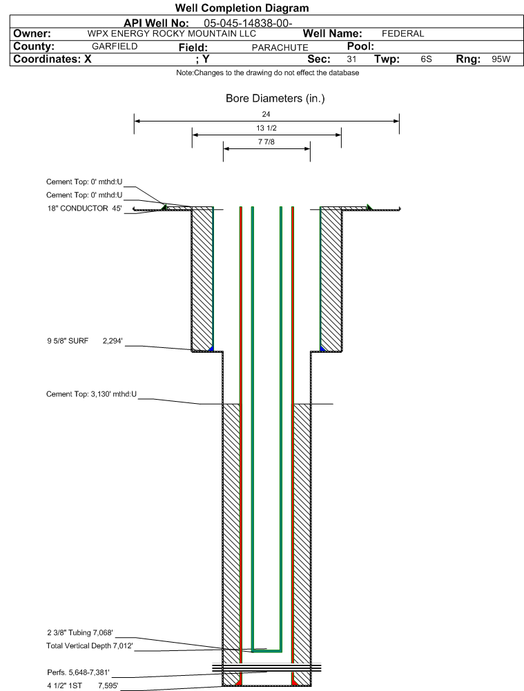 Wellbore #00 Wellbore Classification: GW Status: PR - 10/31/2008 Measured TD: 7605 ft. Vertical TD: 7012 ft.| Wellbore Data for Original Wellbore | Wellbore Classification: GW PR - 10/31/2008 | | Wellbore Permit | DIRECTIONAL | | Permit #: | 20074636 | Expiration Date: | 10/16/2008 | | Proposed Top PZ Location: | Sec: Twp: | Footage: 140 FSL 1481 FEL | | Bottom Hole Location: | Sec:31 Twp: 6S 95W | Footage: 140 FSL 1481 FEL | | Proposed Depth/Form: | 7652 ft. | | Surface Mineral Owner Same: | Yes | | Mineral Owner: | FEDERAL | Surface Owner: | FEDERAL | | Unit: | | Unit Number: | | | Formation And Spacing: | Code: WMFK , Formation: WILLIAMS FORK , Order: 440-25 , Unit Acreage: 320, Drill Unit: E/2 |
