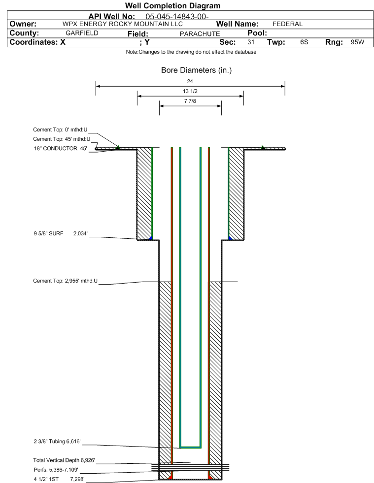 | Wellbore Completed | | Completion Date: | 6/6/2008 | | Spud Date: | 5/29/2008 | Spud Date Is: | ACTUAL | | Measured TD: | 7320 ft. | Measured PB depth: | 7263 ft. | | True Vertical TD: | 6926 ft. | True Vertical PB depth: | 6869 ft. | | Top PZ Location: | Sec:31 Twp: 6S 95W | Footage: 2505 FSL 2436 FEL | | Bottom Hole Location: | Sec:31 Twp: 6S 95W | Footage: 2505 FSL 2436 FEL | | Log Types: | CBL, RMTE, MUD | | Casing: | String Type: CONDUCTOR, Hole Size: 24 in., Size: 18 in., Top: 0 ft., Depth: 45 ft., Weight: 48 , Citings Type: ACTUAL | | Cement: | Sacks: 25, Top: 45 ft., Bottom: 0 ft., Determination Method: | | Casing: | String Type: SURF, Hole Size: 13.5 in., Size: 9.625 in., Top: 0 ft., Depth: 2034 ft., Weight: 36 , Citings Type: ACTUAL | | Cement: | Sacks: 485, Top: 0 ft., Bottom: 2034 ft., Determination Method: | | Casing: | String Type: 1ST, Hole Size: 7.875 in., Size: 4.5 in., Top: 0 ft., Depth: 7298 ft., Weight: 11.6 , Citings Type: ACTUAL | | Cement: | Sacks: 944, Top: 2955 ft., Bottom: 7298 ft., Determination Method: CBL | | Formation | Interval Top | Log Bottom | Cored | DSTs | | WASATCH G | 1686 ft. | | N | N | | MESAVERDE | 4044 ft. | | N | N | | CAMEO | 6615 ft. | | N | N | | ROLLINS | 7188 ft. | | N | N |