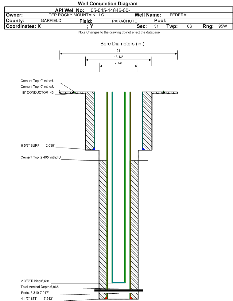 Wellbore #00 Wellbore Classification: GW Status: PR - 9/30/2008 Measured TD: 7258 ft. Vertical TD: 6865 ft.| Wellbore Data for Original Wellbore | Wellbore Classification: GW PR - 9/30/2008 | | Wellbore Permit | DIRECTIONAL | | Permit #: | 20074643 | Expiration Date: | 10/18/2008 | | Proposed Top PZ Location: | Sec: Twp: | Footage: 1562 FSL 1972 FEL | | Bottom Hole Location: | Sec:31 Twp: 6S 95W | Footage: 1562 FSL 1972 FEL | | Proposed Depth/Form: | 7354 ft. | | Surface Mineral Owner Same: | Yes | | Mineral Owner: | FEDERAL | Surface Owner: | FEDERAL | | Unit: | | Unit Number: | | | Formation And Spacing: | Code: WMFK , Formation: WILLIAMS FORK , Order: 440-25 , Unit Acreage: 320, Drill Unit: E/2 |