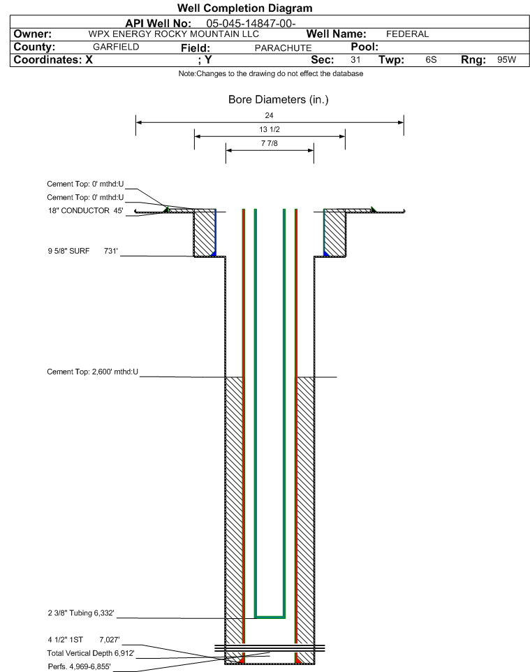 | Wellbore Completed | | Completion Date: | 8/30/2008 | | Spud Date: | 8/21/2008 | Spud Date Is: | ACTUAL | | Measured TD: | 7047 ft. | Measured PB depth: | 6947 ft. | | True Vertical TD: | 6912 ft. | True Vertical PB depth: | 6812 ft. | | Top PZ Location: | Sec:31 Twp: 6S 95W | Footage: 1357 FNL 1334 FEL | | Bottom Hole Location: | Sec:31 Twp: 6S 95W | Footage: 1357 FNL 1334 FEL | | Log Types: | CBL, HIGH RESOLUTION INDUCTION, SPECTRAL DENSITY, DUAL SPACED NEUTRON, MUD | | Casing: | String Type: CONDUCTOR, Hole Size: 24 in., Size: 18 in., Top: 48 ft., Depth: 45 ft., Weight: , Citings Type: ACTUAL | | Cement: | Sacks: 25, Top: 0 ft., Bottom: 45 ft., Determination Method: | | Casing: | String Type: SURF, Hole Size: 13.5 in., Size: 9.625 in., Top: 0 ft., Depth: 731 ft., Weight: , Citings Type: ACTUAL | | Cement: | Sacks: 320, Top: 0 ft., Bottom: 731 ft., Determination Method: | | Casing: | String Type: 1ST, Hole Size: 7.875 in., Size: 4.5 in., Top: 0 ft., Depth: 7027 ft., Weight: , Citings Type: ACTUAL | | Cement: | Sacks: 839, Top: 2600 ft., Bottom: 7027 ft., Determination Method: CBL | | Formation | Interval Top | Log Bottom | Cored | DSTs | | MESAVERDE | 3791 ft. | | N | N | | CAMEO | 6393 ft. | | N | N | | ROLLINS | 6969 ft. | | N | N |