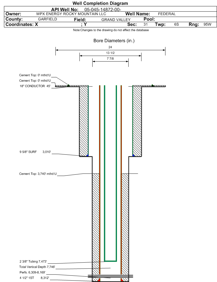 Wellbore #00 Wellbore Classification: GW Status: PR - 8/8/2007 Measured TD: 8330 ft. Vertical TD: 7746 ft.| Wellbore Data for Original Wellbore | Wellbore Classification: GW PR - 8/8/2007 | | Wellbore Permit | DIRECTIONAL | | Permit #: | 20074607 | Expiration Date: | 10/21/2008 | | Proposed Top PZ Location: | Sec: Twp: | Footage: 1555 FSL 204 FEL | | Bottom Hole Location: | Sec:25 Twp: 6S 95W | Footage: 1555 FSL 204 FEL | | Proposed Depth/Form: | 8400 ft. | | Surface Mineral Owner Same: | Yes | | Mineral Owner: | FEDERAL | Surface Owner: | FEDERAL | | Unit: | | Unit Number: | | | Formation And Spacing: | Code: WMFK , Formation: WILLIAMS FORK , Order: 440-25 , Unit Acreage: 320, Drill Unit: S/2 |