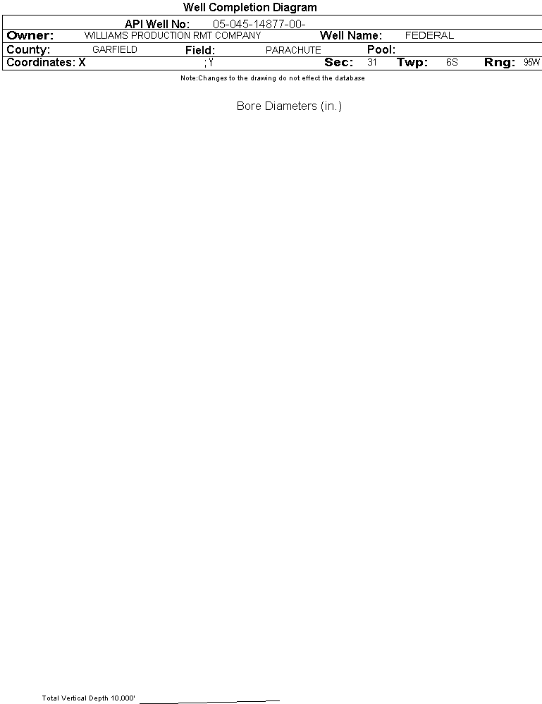 Wellbore #00 Wellbore Classification: Status: AL - 12/12/2008 Measured TD: | Wellbore Data for Original Wellbore | Wellbore Classification: AL - 12/12/2008 | | Wellbore Permit | DIRECTIONAL | | Permit #: | 20074619 | Expiration Date: | 10/21/2008 | | Proposed Top PZ Location: | Sec: Twp: | Footage: 1418 FNL 432 FWL | | Bottom Hole Location: | Sec:31 Twp: 6S 95W | Footage: 1418 FNL 432 FWL | | Proposed Depth/Form: | 7977 ft. | | Surface Mineral Owner Same: | Yes | | Mineral Owner: | FEDERAL | Surface Owner: | FEDERAL | | Unit: | | Unit Number: | | | Formation And Spacing: | Code: WMFK , Formation: WILLIAMS FORK , Order: 440-25 , Unit Acreage: 320, Drill Unit: W/2 | | Casing: | String Type: CONDUCTOR, Hole Size: 24 in., Size: 18 in., Top: , Depth: 40 ft., Weight: 48 , Citings Type: PLANNED | | Cement: | Sacks: , Top: 0 ft., Bottom: 40 ft. | | Casing: | String Type: SURF, Hole Size: 13.5 in., Size: 9.625 in., Top: , Depth: 2816 ft., Weight: 32.3 , Citings Type: PLANNED | | Cement: | Sacks: , Top: 0 ft., Bottom: 2816 ft. | | Casing: | String Type: 1ST, Hole Size: 7.875 in., Size: 4.5 in., Top: , Depth: 7977 ft., Weight: 11.6 , Citings Type: PLANNED | | Cement: | Sacks: , Top: , Bottom: |