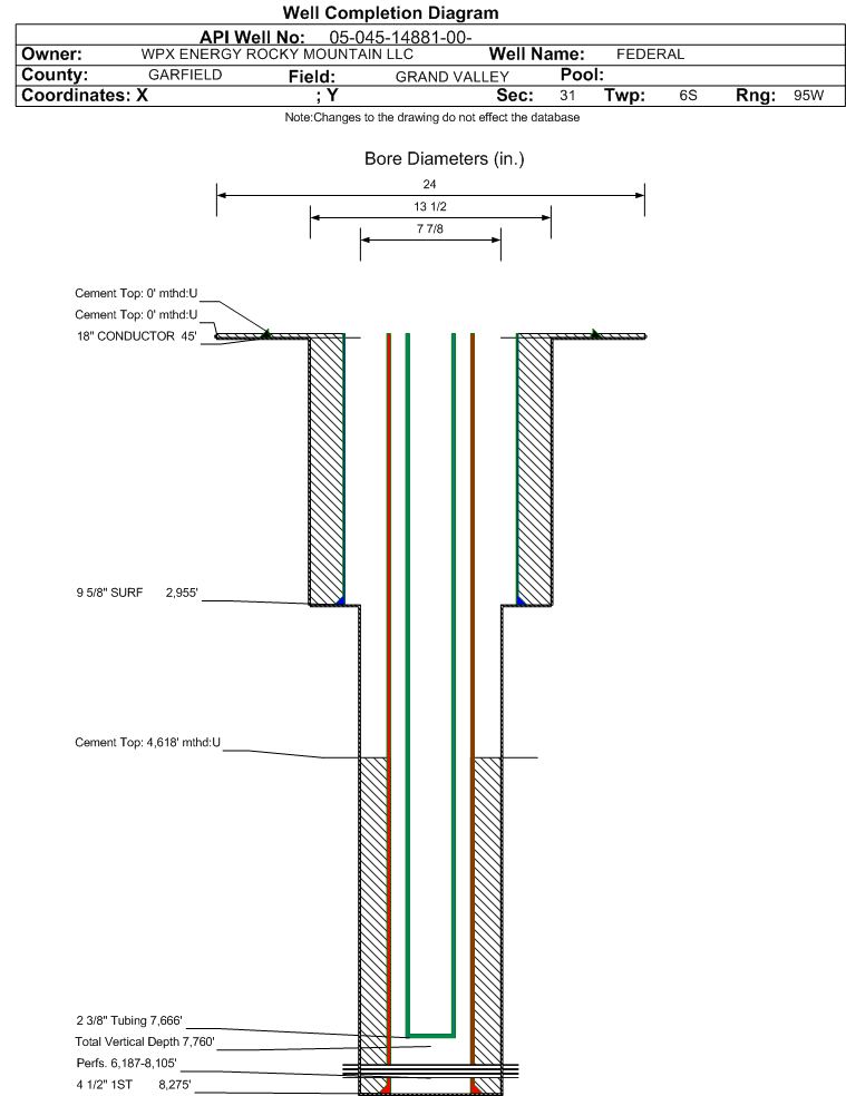 Wellbore #00 Wellbore Classification: GW Status: PR - 1/1/2009 Measured TD: 8292 ft. Vertical TD: 7760 ft.| Wellbore Data for Original Wellbore | Wellbore Classification: GW PR - 1/1/2009 | | Wellbore Permit | DIRECTIONAL | | Permit #: | 20074608 | Expiration Date: | 10/21/2008 | | Proposed Top PZ Location: | Sec: Twp: | Footage: 1182 FSL 333 FEL | | Bottom Hole Location: | Sec:25 Twp: 6S 96W | Footage: 1182 FSL 333 FEL | | Proposed Depth/Form: | 8340 ft. | | Surface Mineral Owner Same: | Yes | | Mineral Owner: | FEDERAL | Surface Owner: | FEDERAL | | Unit: | | Unit Number: | | | Formation And Spacing: | Code: WMFK , Formation: WILLIAMS FORK , Order: 440-25 , Unit Acreage: 320, Drill Unit: S/2 |