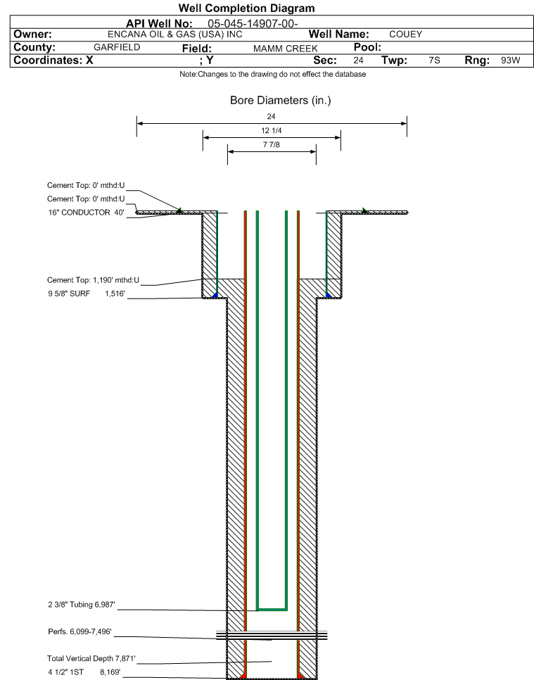 | Wellbore Completed | | Completion Date: | 6/23/2008 | | Spud Date: | 6/12/2008 | Spud Date Is: | ACTUAL | | Measured TD: | 8189 ft. | Measured PB depth: | 7800 ft. | | True Vertical TD: | 7871 ft. | True Vertical PB depth: | 7482 ft. | | Top PZ Location: | Sec:24 Twp: 7S 93W | Footage: 1166 FNL 1895 FEL | | Bottom Hole Location: | Sec:24 Twp: 7S 93W | Footage: 1166 FNL 1895 FEL | | Log Types: | CBL, RST | | Casing: | String Type: CONDUCTOR, Hole Size: 24 in., Size: 16 in., Top: 0 ft., Depth: 40 ft., Weight: , Citings Type: ACTUAL | | Cement: | Sacks: 4, Top: 0 ft., Bottom: 40 ft., Determination Method: CALC | | Casing: | String Type: SURF, Hole Size: 12.25 in., Size: 9.625 in., Top: 0 ft., Depth: 1516 ft., Weight: , Citings Type: ACTUAL | | Cement: | Sacks: 544, Top: 0 ft., Bottom: 1521 ft., Determination Method: CALC | | Casing: | String Type: 1ST, Hole Size: 7.875 in., Size: 4.5 in., Top: 0 ft., Depth: 8169 ft., Weight: , Citings Type: ACTUAL | | Cement: | Sacks: 1129, Top: 1190 ft., Bottom: 8169 ft., Determination Method: CBL | | Formation | Interval Top | Log Bottom | Cored | DSTs | | WASATCH | 0 ft. | 4958 ft. | N | N | | WILLIAMS FORK | 4959 ft. | 6090 ft. | N | N | | ROLLINS | 7916 ft. | 8189 ft. | N | N |