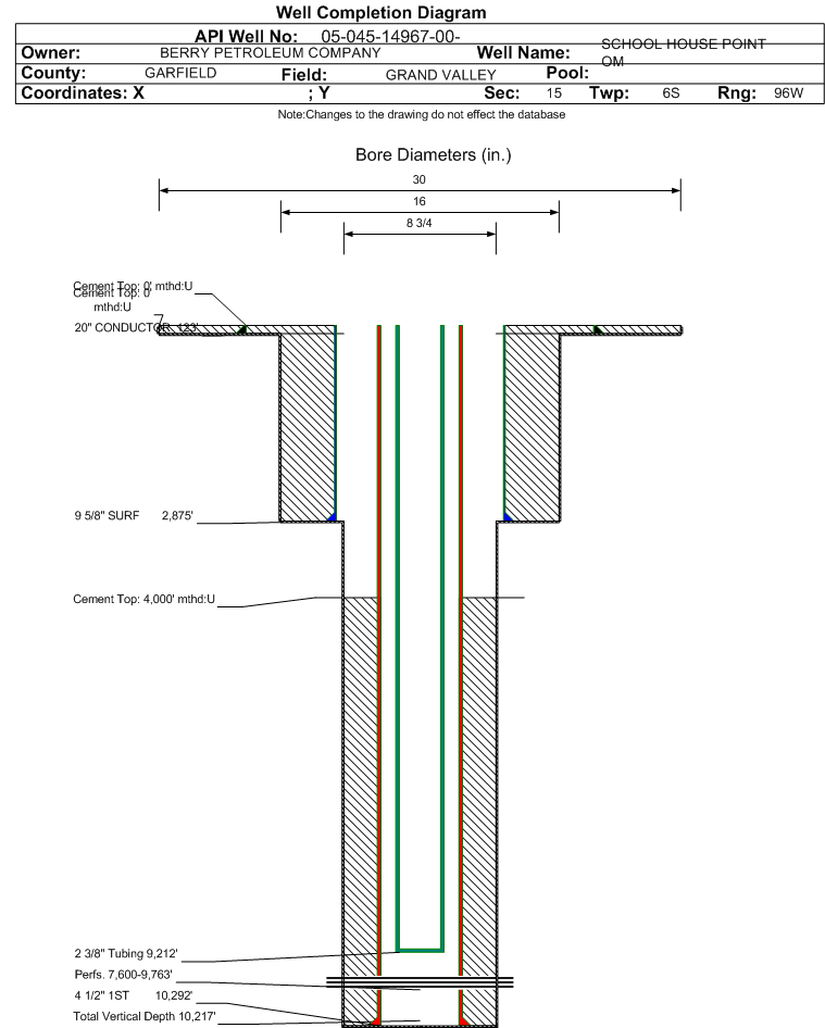 Wellbore #00 Wellbore Classification: GW Status: PR - 5/1/2012 Measured TD: 10345 ft. Vertical TD: 10217 ft.| Wellbore Data for Original Wellbore | Wellbore Classification: GW PR - 5/1/2012 | | Wellbore Permit | DIRECTIONAL | | Permit #: | | Expiration Date: | 8/3/2012 | | Proposed Top PZ Location: | Sec:15 Twp: 6S 96W | Footage: 1565 FSL 1635 FWL | | Bottom Hole Location: | Sec:15 Twp: 6S 96W | Footage: 1565 FSL 1635 FWL | | Proposed Depth/Form: | 10371 ft. | | Surface Mineral Owner Same: | Yes | | Mineral Owner: | FEE | Surface Owner: | FEE | | Unit: | | Unit Number: | | | Formation And Spacing: | Code: WMFK , Formation: WILLIAMS FORK , Order: 510-13 , Unit Acreage: , Drill Unit: NWSW | | Casing: | String Type: CONDUCTOR, Hole Size: 30 in., Size: 20 in., Top: , Depth: 90 ft., Weight: 55 , Citings Type: PLANNED | | Cement: | Sacks: 100, Top: 0 ft., Bottom: 90 ft. | | Casing: | String Type: SURF, Hole Size: 16 in., Size: 9.625 in., Top: , Depth: 2500 ft., Weight: 36 , Citings Type: PLANNED | | Cement: | Sacks: 1000, Top: 0 ft., Bottom: 2500 ft. | | Casing: | String Type: 1ST, Hole Size: 8.75 in., Size: 4.5 in., Top: , Depth: 10171 ft., Weight: 11.6 , Citings Type: PLANNED | | Cement: | Sacks: 1200, Top: 6500 ft., Bottom: 10171 ft. | | Casing: | String Type: 3RD, Hole Size: 8.75 in., Size: 4.5 in., Top: , Depth: 10371 ft., Weight: 11.6 , Citings Type: PLANNED | | Cement: | Sacks: 600, Top: , Bottom: 10371 ft. |
