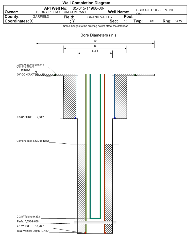 Wellbore #00 Wellbore Classification: GW Status: PR - 5/1/2012 Measured TD: 10283 ft. Vertical TD: 10180 ft.| Wellbore Data for Original Wellbore | Wellbore Classification: GW PR - 5/1/2012 | | Wellbore Permit | DIRECTIONAL | | Permit #: | | Expiration Date: | 8/3/2012 | | Proposed Top PZ Location: | Sec:15 Twp: 6S 96W | Footage: 2245 FSL 345 FWL | | Bottom Hole Location: | Sec:15 Twp: 6S 96W | Footage: 2245 FSL 345 FWL | | Proposed Depth/Form: | 10430 ft. | | Surface Mineral Owner Same: | Yes | | Mineral Owner: | FEE | Surface Owner: | FEE | | Unit: | | Unit Number: | | | Formation And Spacing: | Code: WMFK , Formation: WILLIAMS FORK , Order: 510-13 , Unit Acreage: , Drill Unit: NWSW | | Casing: | String Type: CONDUCTOR, Hole Size: 30 in., Size: 20 in., Top: , Depth: 90 ft., Weight: 55 , Citings Type: PLANNED | | Cement: | Sacks: 100, Top: 0 ft., Bottom: 90 ft. | | Casing: | String Type: SURF, Hole Size: 16 in., Size: 9.625 in., Top: , Depth: 2500 ft., Weight: 36 , Citings Type: PLANNED | | Cement: | Sacks: 1000, Top: 0 ft., Bottom: 2500 ft. | | Casing: | String Type: 1ST, Hole Size: 8.75 in., Size: 4.5 in., Top: , Depth: 10230 ft., Weight: 11.6 , Citings Type: PLANNED | | Cement: | Sacks: 1200, Top: 6500 ft., Bottom: 10230 ft. | | Casing: | String Type: 3RD, Hole Size: 8.75 in., Size: 4.5 in., Top: , Depth: 10430 ft., Weight: 11.6 , Citings Type: PLANNED | | Cement: | Sacks: 600, Top: , Bottom: 10430 ft. |