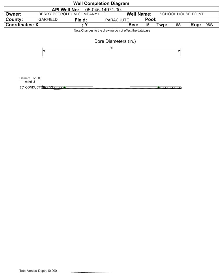 | Wellbore Completed | | Completion Date: | N/A | | Measured TD: | | Measured PB depth: | | | True Vertical TD: | | True Vertical PB depth: | | | Casing: | String Type: CONDUCTOR, Hole Size: 30 in., Size: 20 in., Top: 0 ft., Depth: 100 ft., Weight: 55 , Citings Type: ACTUAL | | Cement: | Sacks: , Top: , Bottom: , Determination Method: | | No formation data to display. |