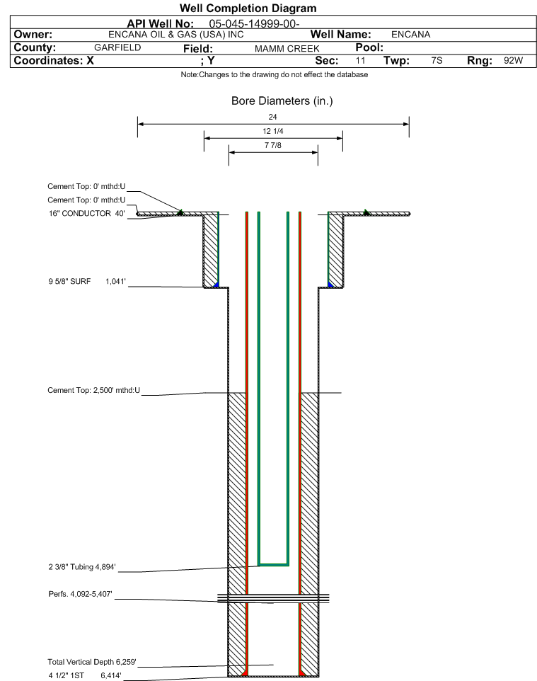 | Wellbore Completed | | Completion Date: | 9/14/2008 | | Spud Date: | 9/3/2008 | Spud Date Is: | ACTUAL | | Measured TD: | 6424 ft. | Measured PB depth: | 5723 ft. | | True Vertical TD: | 6259 ft. | True Vertical PB depth: | 5558 ft. | | Top PZ Location: | Sec:11 Twp: 7S 92W | Footage: 597 FNL 1706 FWL | | Bottom Hole Location: | Sec:11 Twp: 7S 92W | Footage: 597 FNL 1706 FWL | | Log Types: | CBL, IND/DEN/NEU, BOREHOLE PROFILE | | Casing: | String Type: CONDUCTOR, Hole Size: 24 in., Size: 16 in., Top: 0 ft., Depth: 40 ft., Weight: , Citings Type: ACTUAL | | Cement: | Sacks: 100, Top: 0 ft., Bottom: 40 ft., Determination Method: CALC | | Casing: | String Type: SURF, Hole Size: 12.25 in., Size: 9.625 in., Top: 0 ft., Depth: 1041 ft., Weight: , Citings Type: ACTUAL | | Cement: | Sacks: 511, Top: 0 ft., Bottom: 1041 ft., Determination Method: CALC | | Casing: | String Type: 1ST, Hole Size: 7.875 in., Size: 4.5 in., Top: 0 ft., Depth: 6414 ft., Weight: , Citings Type: ACTUAL | | Cement: | Sacks: 1328, Top: 2500 ft., Bottom: 6413 ft., Determination Method: CBL | | Formation | Interval Top | Log Bottom | Cored | DSTs | | WASATCH | 0 ft. | 3124 ft. | N | N | | WILLIAMS FORK | 3124 ft. | 6286 ft. | N | N | | ROLLINS | 6286 ft. | 6424 ft. | N | N |