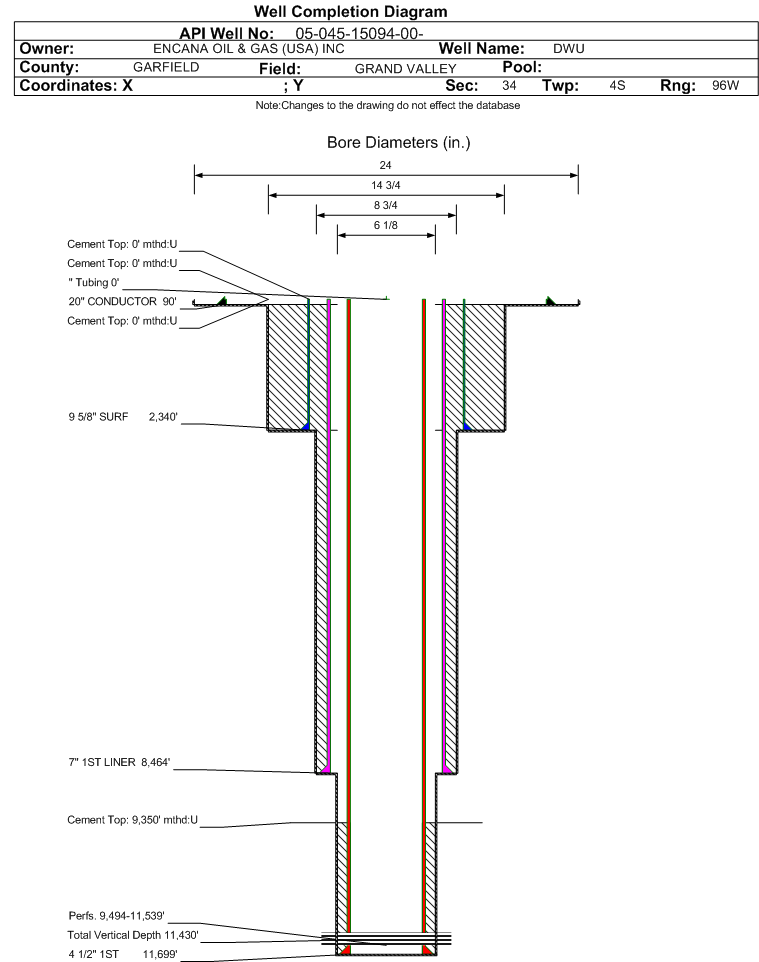 | Wellbore Completed | | Completion Date: | 6/17/2008 | | Spud Date: | 5/17/2008 | Spud Date Is: | ACTUAL | | Measured TD: | 12015 ft. | Measured PB depth: | 11555 ft. | | True Vertical TD: | 11430 ft. | True Vertical PB depth: | 10972 ft. | | Top PZ Location: | Sec:33 Twp: 4S 96W | Footage: 257 FNL 848 FEL | | Bottom Hole Location: | Sec:33 Twp: 4S 96W | Footage: 257 FNL 848 FEL | | Log Types: | RADIAL BOND LOG, RECORDED MODE LOG, FORMATION EVALUATION TOOL, MUDLOG | | Casing: | String Type: CONDUCTOR, Hole Size: 24 in., Size: 20 in., Top: 0 ft., Depth: 90 ft., Weight: , Citings Type: ACTUAL | | Cement: | Sacks: 6, Top: 0 ft., Bottom: 90 ft., Determination Method: CALC | | Casing: | String Type: SURF, Hole Size: 14.75 in., Size: 9.625 in., Top: 0 ft., Depth: 2340 ft., Weight: , Citings Type: ACTUAL | | Cement: | Sacks: 1203, Top: 0 ft., Bottom: 2340 ft., Determination Method: CALC | | Casing: | String Type: 1ST, Hole Size: 6.125 in., Size: 4.5 in., Top: 0 ft., Depth: 11699 ft., Weight: , Citings Type: ACTUAL | | Cement: | Sacks: 288, Top: 9350 ft., Bottom: 11699 ft., Determination Method: CBL | | Casing: | String Type: 1ST LINER, Hole Size: 8.75 in., Size: 7 in., Top: 0 ft., Depth: 8464 ft., Weight: , Citings Type: ACTUAL | | Cement: | Sacks: 950, Top: 0 ft., Bottom: 8464 ft., Determination Method: CALC | | Formation | Interval Top | Log Bottom | Cored | DSTs | | WASATCH | 3800 ft. | | N | N | | OHIO CREEK | 7540 ft. | | N | N | | WILLIAMS FORK | 8028 ft. | | N | N | | CAMEO | 11190 ft. | | N | N | | ROLLINS | 11811 ft. | | N | N |