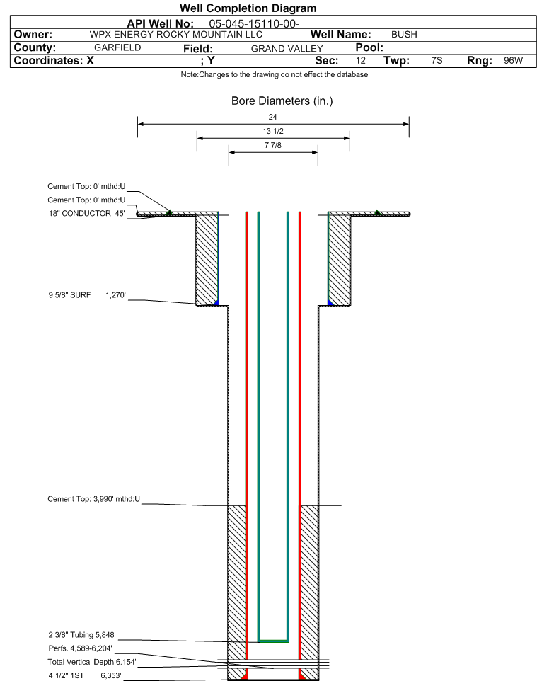 | Wellbore Completed | | Completion Date: | 3/20/2008 | | Spud Date: | 3/12/2008 | Spud Date Is: | ACTUAL | | Measured TD: | 6384 ft. | Measured PB depth: | 6340 ft. | | True Vertical TD: | 6154 ft. | True Vertical PB depth: | | | Top PZ Location: | Sec:12 Twp: 7S 96W | Footage: 1857 FSL 2081 FWL | | Bottom Hole Location: | Sec:12 Twp: 7S 96W | Footage: 1857 FSL 2081 FWL | | Log Types: | CBL; RMTE; MUD | | Casing: | String Type: CONDUCTOR, Hole Size: 24 in., Size: 18 in., Top: 0 ft., Depth: 45 ft., Weight: 48 , Citings Type: ACTUAL | | Cement: | Sacks: 25, Top: 0 ft., Bottom: 45 ft., Determination Method: CALC | | Casing: | String Type: SURF, Hole Size: 13.5 in., Size: 9.625 in., Top: 0 ft., Depth: 1270 ft., Weight: 32.3 , Citings Type: ACTUAL | | Cement: | Sacks: 345, Top: 0 ft., Bottom: 1270 ft., Determination Method: CALC | | Casing: | String Type: 1ST, Hole Size: 7.875 in., Size: 4.5 in., Top: 0 ft., Depth: 6353 ft., Weight: 11.6 , Citings Type: ACTUAL | | Cement: | Sacks: 649, Top: 3990 ft., Bottom: 6353 ft., Determination Method: CBL | | Formation | Interval Top | Log Bottom | Cored | DSTs | | WASATCH G | 1327 ft. | | N | N | | MESAVERDE | 3299 ft. | | N | N | | CAMEO | 5828 ft. | | N | N | | ROLLINS | 6280 ft. | | N | N |