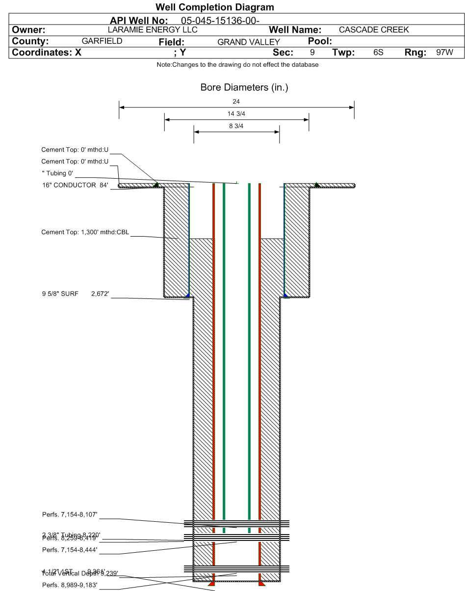| Wellbore Completed | | Completion Date: | 10/20/2008 | | Spud Date: | 9/28/2008 | Spud Date Is: | ACTUAL | | Measured TD: | 9361 ft. | Measured PB depth: | 9285 ft. | | True Vertical TD: | 9239 ft. | True Vertical PB depth: | 9163 ft. | | Top PZ Location: | Sec:9 Twp: 6S 97W | Footage: 1306 FSL 2181 FWL | | Bottom Hole Location: | Sec:9 Twp: 6S 97W | Footage: 1306 FSL 2181 FWL | | Log Types: | ACOUSTIC CBL, TEMP, RMTE | | Casing: | String Type: CONDUCTOR, Hole Size: 24 in., Size: 16 in., Top: 0 ft., Depth: 84 ft., Weight: , Citings Type: ACTUAL | | Cement: | Sacks: 4, Top: 0 ft., Bottom: 84 ft., Determination Method: | | Casing: | String Type: SURF, Hole Size: 14.75 in., Size: 9.625 in., Top: 0 ft., Depth: 2672 ft., Weight: , Citings Type: ACTUAL | | Cement: | Sacks: 1475, Top: 0 ft., Bottom: 2672 ft., Determination Method: | | Casing: | String Type: 1ST, Hole Size: 8.75 in., Size: 4.5 in., Top: 0 ft., Depth: 9361 ft., Weight: , Citings Type: ACTUAL | | Cement: | Sacks: 1502, Top: 1300 ft., Bottom: 9361 ft., Determination Method: CBL | | Formation | Interval Top | Log Bottom | Cored | DSTs | | WASATCH G | 2671 ft. | | N | N | | FORT UNION | 4489 ft. | | N | N | | MESAVERDE | 5807 ft. | | N | N | | CAMEO | 8218 ft. | | N | N | | ROLLINS | 8689 ft. | | N | N | | COZZETTE | 8908 ft. | | N | N | | CORCORAN | 9218 ft. | | N | N |
