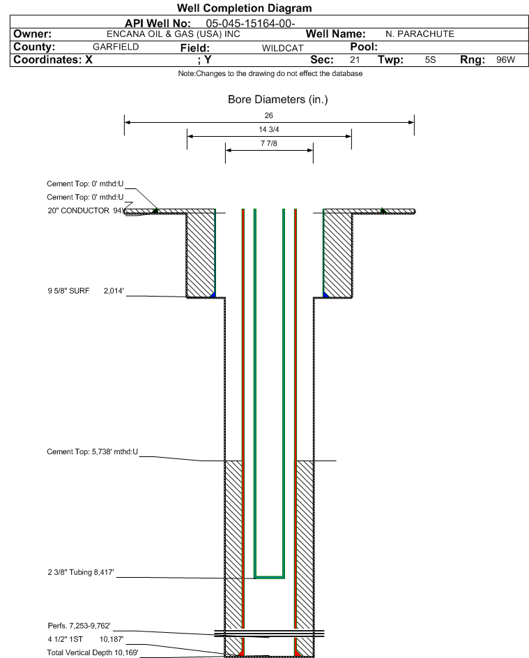 | Wellbore Completed | | Completion Date: | 12/9/2009 | | Spud Date: | 3/17/2008 | Spud Date Is: | ACTUAL | | Measured TD: | 10190 ft. | Measured PB depth: | 10106 ft. | | True Vertical TD: | 10169 ft. | True Vertical PB depth: | 10085 ft. | | Top PZ Location: | Sec:21 Twp: 5S 96W | Footage: 1618 FNL 2243 FEL | | Bottom Hole Location: | Sec:21 Twp: 5S 96W | Footage: 1618 FNL 2243 FEL | | Log Types: | TEMP | | Log Types: | GR/CBL/CCL; CBL AND MUD LAS FILES APPROVED | | Casing: | String Type: CONDUCTOR, Hole Size: 26 in., Size: 20 in., Top: 0 ft., Depth: 94 ft., Weight: , Citings Type: ACTUAL | | Cement: | Sacks: 6, Top: 0 ft., Bottom: 94 ft., Determination Method: | | Casing: | String Type: SURF, Hole Size: 14.75 in., Size: 9.625 in., Top: 0 ft., Depth: 2014 ft., Weight: , Citings Type: ACTUAL | | Cement: | Sacks: 1480, Top: 0 ft., Bottom: 2014 ft., Determination Method: CALC | | Casing: | String Type: 1ST, Hole Size: 7.875 in., Size: 4.5 in., Top: 0 ft., Depth: 10187 ft., Weight: , Citings Type: ACTUAL | | Cement: | Sacks: 1017, Top: 5738 ft., Bottom: 10187 ft., Determination Method: CBL | | Formation | Interval Top | Log Bottom | Cored | DSTs | | WASATCH A | 2384 ft. | | N | N | | WASATCH B | 2856 ft. | | N | N | | WILLIAMS FORK | 6747 ft. | | N | N | | CAMEO | 9380 ft. | | N | N | | ROLLINS | 9976 ft. | | N | N |