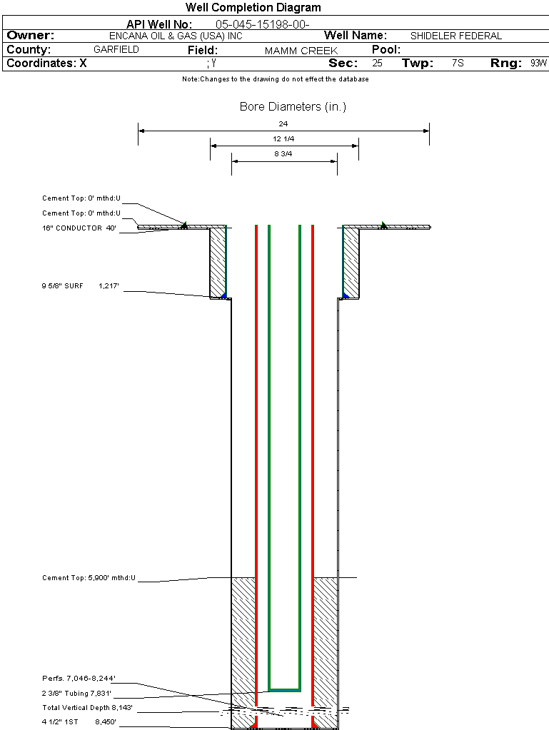 | Wellbore Completed | | Completion Date: | 2/12/2008 | | Spud Date: | 1/27/2008 | Spud Date Is: | ACTUAL | | Measured TD: | 8450 ft. | Measured PB depth: | 8388 ft. | | True Vertical TD: | 8143 ft. | True Vertical PB depth: | 8081 ft. | | Top PZ Location: | Sec:26 Twp: 7S 93W | Footage: 2542 FNL 667 FEL | | Bottom Hole Location: | Sec:26 Twp: 7S 93W | Footage: 2542 FNL 667 FEL | | Log Types: | RST, CBL | | Casing: | String Type: CONDUCTOR, Hole Size: 24 in., Size: 16 in., Top: 0 ft., Depth: 40 ft., Weight: , Citings Type: ACTUAL | | Cement: | Sacks: , Top: 0 ft., Bottom: 40 ft., Determination Method: CALC | | Casing: | String Type: SURF, Hole Size: 12.25 in., Size: 9.625 in., Top: 0 ft., Depth: 1217 ft., Weight: , Citings Type: ACTUAL | | Cement: | Sacks: 504, Top: 0 ft., Bottom: 1250 ft., Determination Method: CALC | | Casing: | String Type: 1ST, Hole Size: 8.75 in., Size: 4.5 in., Top: 0 ft., Depth: 8450 ft., Weight: , Citings Type: ACTUAL | | Cement: | Sacks: 1008, Top: 5900 ft., Bottom: 8450 ft., Determination Method: CBL | | Formation | Interval Top | Log Bottom | Cored | DSTs | | WASATCH | 0 ft. | 5933 ft. | N | N | | WILLIAMS FORK | 5933 ft. | 8450 ft. | N | N |