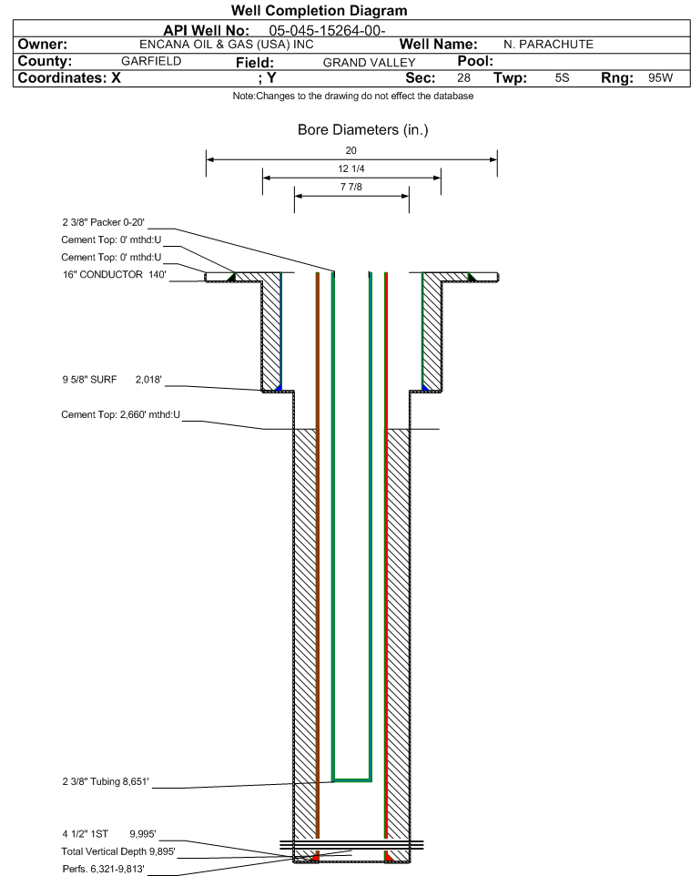 Wellbore #00 Wellbore Classification: GW Status: PR - 7/1/2024 Measured TD: 10030 ft. Vertical TD: 9895 ft.| Wellbore Data for Original Wellbore | Wellbore Classification: GW PR - 7/1/2024 | | Wellbore Permit | DIRECTIONAL | | Permit #: | 20076199 | Expiration Date: | 12/27/2008 | | Proposed Top PZ Location: | Sec: Twp: | Footage: 1446 FNL 763 FEL | | Bottom Hole Location: | Sec:28 Twp: 5S 95W | Footage: 1446 FNL 763 FEL | | Proposed Depth/Form: | 11587 ft. | | Surface Mineral Owner Same: | Yes | | Mineral Owner: | FEE | Surface Owner: | FEE | | Unit: | | Unit Number: | | | Formation And Spacing: | Code: WMFK , Formation: WILLIAMS FORK , Order: 510-13 , Unit Acreage: , Drill Unit: | | Casing: | String Type: 1ST, Hole Size: 8.75 in., Size: 4.5 in., Top: , Depth: 11587 ft., Weight: 11.6 , Citings Type: PLANNED | | Cement: | Sacks: 1295, Top: 2500 ft., Bottom: 11587 ft. |