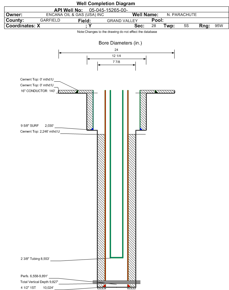 | Wellbore Completed | | Completion Date: | 11/11/2008 | | Spud Date: | 10/1/2008 | Spud Date Is: | ACTUAL | | Measured TD: | 10040 ft. | Measured PB depth: | 9992 ft. | | True Vertical TD: | 9827 ft. | True Vertical PB depth: | 9779 ft. | | Top PZ Location: | Sec:28 Twp: 5S 95W | Footage: 2007 FNL 633 FEL | | Bottom Hole Location: | Sec:28 Twp: 5S 95W | Footage: 2007 FNL 633 FEL | | Log Types: | CBL, MUD, RST | | Casing: | String Type: CONDUCTOR, Hole Size: 24 in., Size: 16 in., Top: 0 ft., Depth: 140 ft., Weight: 65 , Citings Type: ACTUAL | | Cement: | Sacks: , Top: 0 ft., Bottom: 140 ft., Determination Method: CALC | | Casing: | String Type: SURF, Hole Size: 12.25 in., Size: 9.625 in., Top: 0 ft., Depth: 2030 ft., Weight: 36 , Citings Type: ACTUAL | | Cement: | Sacks: 440, Top: 0 ft., Bottom: 2030 ft., Determination Method: CALC | | Casing: | String Type: 1ST, Hole Size: 7.875 in., Size: 4.5 in., Top: 0 ft., Depth: 10024 ft., Weight: 11.6 , Citings Type: ACTUAL | | Cement: | Sacks: 1654, Top: 2246 ft., Bottom: 10124 ft., Determination Method: CBL | | Formation | Interval Top | Log Bottom | Cored | DSTs | | WILLIAMS FORK | 6342 ft. | 9954 ft. | N | N | | ROLLINS | 9954 ft. | 10040 ft. | N | N |