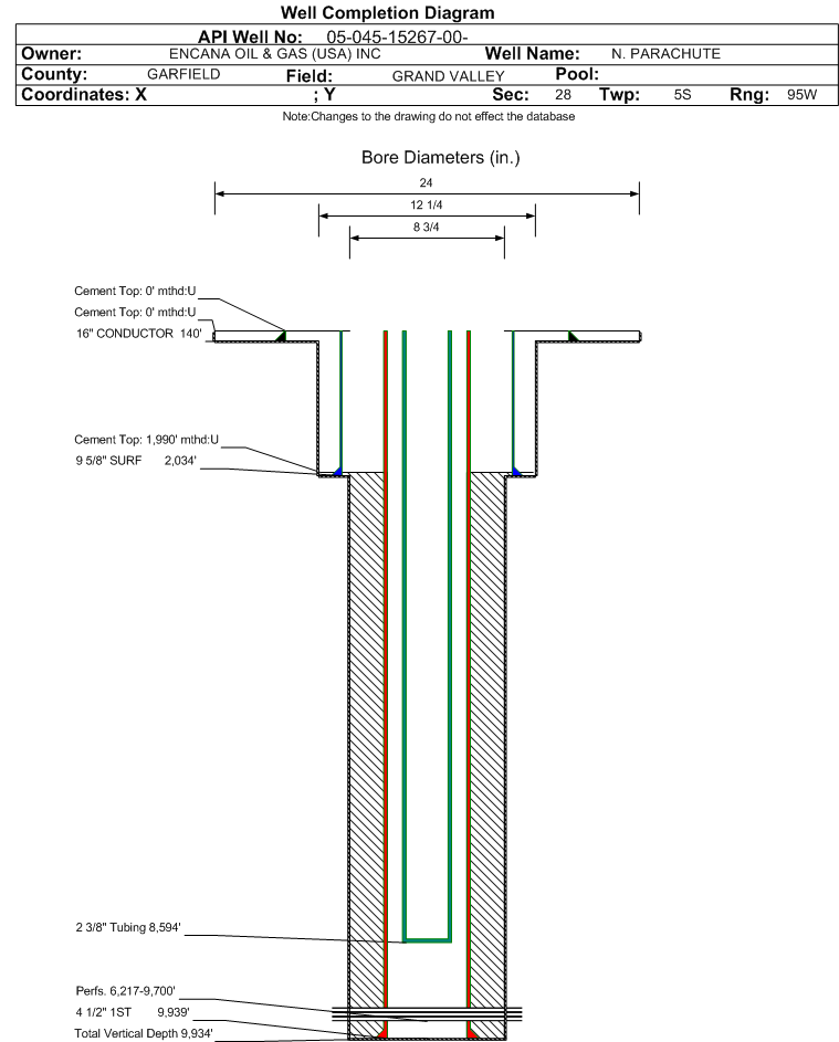 | Wellbore Completed | | Completion Date: | 2/6/2010 | | Spud Date: | 9/25/2008 | Spud Date Is: | ACTUAL | | Measured TD: | 9960 ft. | Measured PB depth: | 9887 ft. | | True Vertical TD: | 9934 ft. | True Vertical PB depth: | 9861 ft. | | Top PZ Location: | Sec:28 Twp: 5S 95W | Footage: 688 FNL 777 FEL | | Bottom Hole Location: | Sec:28 Twp: 5S 95W | Footage: 708 FNL 793 FEL | | Log Types: | | | Log Types: | CBL, MUD AND RST | | Casing: | String Type: CONDUCTOR, Hole Size: 24 in., Size: 16 in., Top: 0 ft., Depth: 140 ft., Weight: , Citings Type: ACTUAL | | Cement: | Sacks: 1275, Top: 0 ft., Bottom: 0 ft., Determination Method: CALC | | Casing: | String Type: SURF, Hole Size: 12.25 in., Size: 9.625 in., Top: 0 ft., Depth: 2034 ft., Weight: , Citings Type: ACTUAL | | Cement: | Sacks: 439, Top: 0 ft., Bottom: 0 ft., Determination Method: CALC | | Casing: | String Type: 1ST, Hole Size: 8.75 in., Size: 4.5 in., Top: 0 ft., Depth: 9939 ft., Weight: , Citings Type: ACTUAL | | Cement: | Sacks: 1294, Top: 1990 ft., Bottom: 9960 ft., Determination Method: CBL | | Formation | Interval Top | Log Bottom | Cored | DSTs | | WILLIAMS FORK | 6198 ft. | 9784 ft. | | | | ROLLINS | 9784 ft. | 9960 ft. | | |