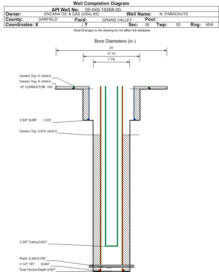 | Wellbore Completed | | Completion Date: | 1/18/2010 | | Spud Date: | 1/6/2010 | Spud Date Is: | ACTUAL | | Measured TD: | 9985 ft. | Measured PB depth: | 9897 ft. | | True Vertical TD: | 9927 ft. | True Vertical PB depth: | 9839 ft. | | Top PZ Location: | Sec:28 Twp: 5S 95W | Footage: 23 FNL 1127 FEL | | Bottom Hole Location: | Sec:28 Twp: 5S 95W | Footage: 42 FNL 1152 FEL | | Log Types: | CBL, MUD AND RESERVOIR SATURATION TOOL | | Casing: | String Type: CONDUCTOR, Hole Size: 24 in., Size: 16 in., Top: 0 ft., Depth: 140 ft., Weight: , Citings Type: ACTUAL | | Cement: | Sacks: , Top: 0 ft., Bottom: 140 ft., Determination Method: CALC | | Casing: | String Type: SURF, Hole Size: 12.25 in., Size: 9.625 in., Top: 0 ft., Depth: 1819 ft., Weight: , Citings Type: ACTUAL | | Cement: | Sacks: 402, Top: 0 ft., Bottom: 1819 ft., Determination Method: CALC | | Casing: | String Type: 1ST, Hole Size: 7.875 in., Size: 4.5 in., Top: 0 ft., Depth: 9944 ft., Weight: , Citings Type: ACTUAL | | Cement: | Sacks: 1275, Top: 2610 ft., Bottom: 9985 ft., Determination Method: CBL | | Formation | Interval Top | Log Bottom | Cored | DSTs | | WILLIAMS FORK | 6221 ft. | 9846 ft. | | | | ROLLINS | 9846 ft. | 9985 ft. | | |
