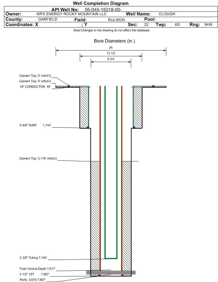Wellbore #00 Wellbore Classification: GW Status: PR - 11/1/2007 Measured TD: 7890 ft. Vertical TD: 7617 ft.| Wellbore Data for Original Wellbore | Wellbore Classification: GW PR - 11/1/2007 | | Wellbore Permit | DIRECTIONAL | | Permit #: | 20076277 | Expiration Date: | 1/3/2009 | | Proposed Top PZ Location: | Sec: Twp: | Footage: 2304 FSL 461 FEL | | Bottom Hole Location: | Sec:22 Twp: 6S 94W | Footage: 2304 FSL 461 FEL | | Proposed Depth/Form: | 7943 ft. | | Surface Mineral Owner Same: | Yes | | Mineral Owner: | FEE | Surface Owner: | FEE | | Unit: | | Unit Number: | | | Formation And Spacing: | Code: WMFK , Formation: WILLIAMS FORK , Order: 139-66 , Unit Acreage: 320, Drill Unit: S/2 |