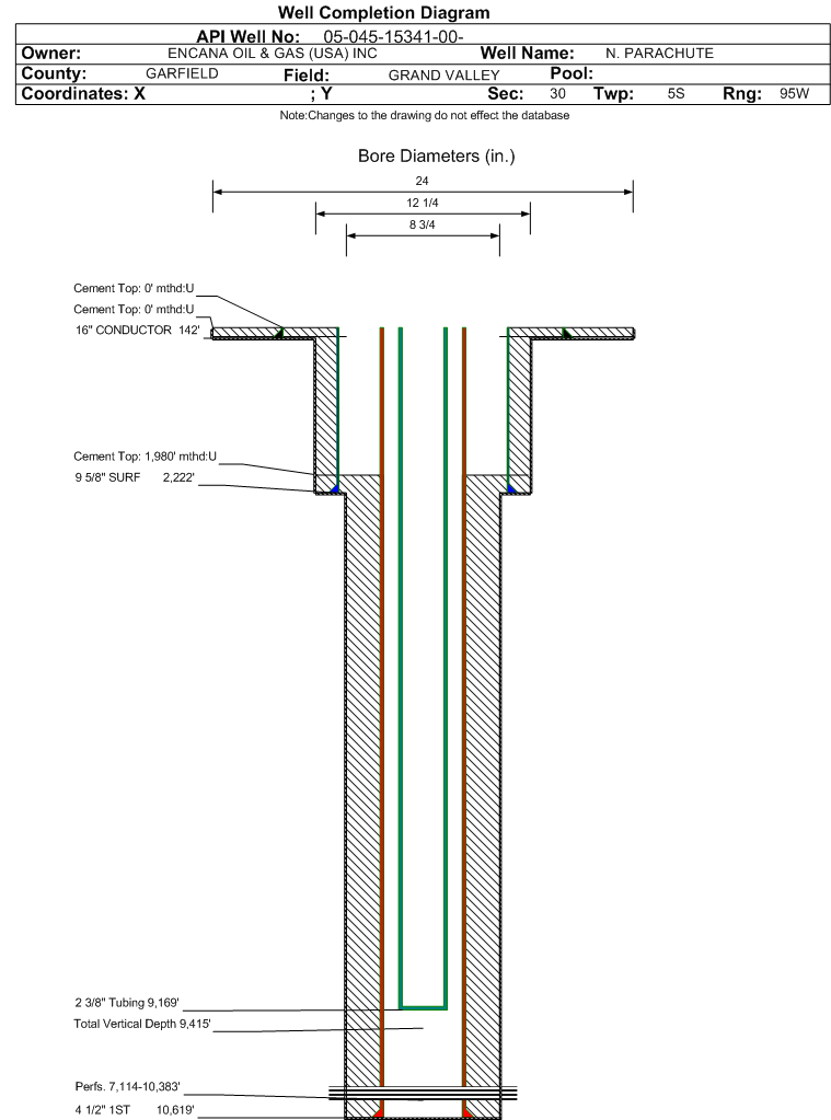 | Wellbore Completed | | Completion Date: | 11/2/2009 | | Spud Date: | 10/23/2008 | Spud Date Is: | ACTUAL | | Measured TD: | 10630 ft. | Measured PB depth: | 10582 ft. | | True Vertical TD: | 9415 ft. | True Vertical PB depth: | 9367 ft. | | Top PZ Location: | Sec:19 Twp: 5S 95W | Footage: 256 FSL 657 FEL | | Bottom Hole Location: | Sec:19 Twp: 5S 95W | Footage: 256 FSL 657 FEL | | Log Types: | MUD, CBL, RST | | Casing: | String Type: CONDUCTOR, Hole Size: 24 in., Size: 16 in., Top: 0 ft., Depth: 142 ft., Weight: , Citings Type: ACTUAL | | Cement: | Sacks: 275, Top: 0 ft., Bottom: 120 ft., Determination Method: CALC | | Casing: | String Type: SURF, Hole Size: 12.25 in., Size: 9.625 in., Top: 0 ft., Depth: 2222 ft., Weight: 36 , Citings Type: ACTUAL | | Cement: | Sacks: 477, Top: 0 ft., Bottom: 2222 ft., Determination Method: CALC | | Casing: | String Type: 1ST, Hole Size: 8.75 in., Size: 4.5 in., Top: 0 ft., Depth: 10619 ft., Weight: 11.6 , Citings Type: ACTUAL | | Cement: | Sacks: 1625, Top: 1980 ft., Bottom: 10623 ft., Determination Method: CBL | | Formation | Interval Top | Log Bottom | Cored | DSTs | | WILLIAMS FORK | 6916 ft. | 10495 ft. | N | N | | ROLLINS | 10495 ft. | 10630 ft. | N | N |