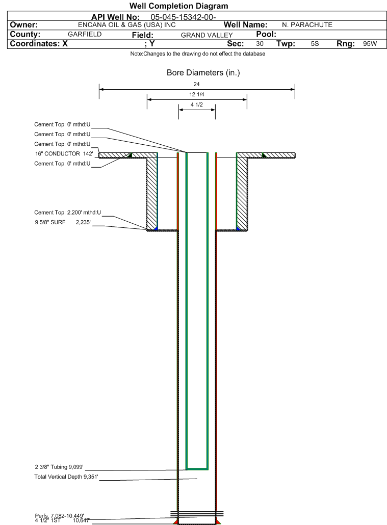 Wellbore #00 Wellbore Classification: GW Status: PR - 1/1/2021 Measured TD: 10661 ft. Vertical TD: 9351 ft.| Wellbore Data for Original Wellbore | Wellbore Classification: GW PR - 1/1/2021 | | Wellbore Permit | DIRECTIONAL | | Permit #: | 20076453 | Expiration Date: | 1/7/2009 | | Proposed Top PZ Location: | Sec:29 Twp: 5S 95W | Footage: 222 FNL 1356 FWL | | Bottom Hole Location: | Sec:29 Twp: 5S 95W | Footage: 222 FNL 1356 FWL | | Proposed Depth/Form: | 12269 ft. | | Surface Mineral Owner Same: | Yes | | Mineral Owner: | FEE | Surface Owner: | FEE | | Unit: | | Unit Number: | | | Formation And Spacing: | Code: WMFK , Formation: WILLIAMS FORK , Order: 479-15, 51, Unit Acreage: , Drill Unit: |