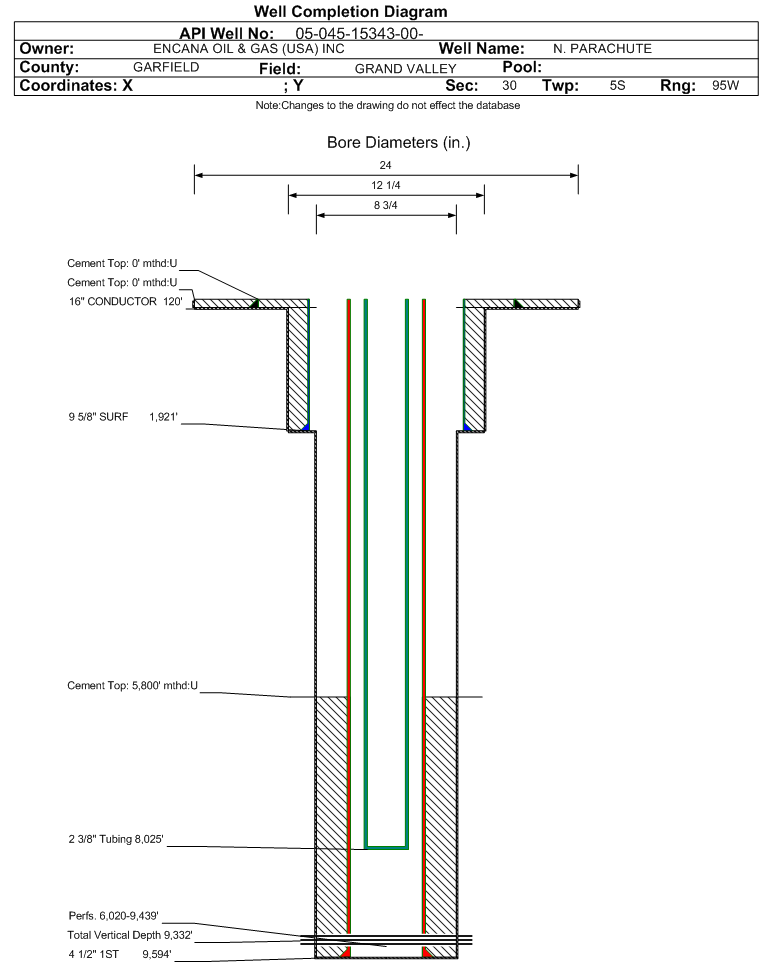 | Wellbore Completed | | Completion Date: | 10/5/2008 | | Spud Date: | 8/13/2008 | Spud Date Is: | ACTUAL | | Measured TD: | 9605 ft. | Measured PB depth: | 9562 ft. | | True Vertical TD: | 9332 ft. | True Vertical PB depth: | | | Top PZ Location: | Sec:29 Twp: 5S 95W | Footage: 1904 FNL 138 FWL | | Bottom Hole Location: | Sec:29 Twp: 5S 95W | Footage: 1904 FNL 138 FWL | | Log Types: | CBL, MUD | | Casing: | String Type: CONDUCTOR, Hole Size: 24 in., Size: 16 in., Top: 0 ft., Depth: 120 ft., Weight: , Citings Type: ACTUAL | | Cement: | Sacks: 275, Top: 0 ft., Bottom: 120 ft., Determination Method: | | Casing: | String Type: SURF, Hole Size: 12.25 in., Size: 9.625 in., Top: 0 ft., Depth: 1921 ft., Weight: , Citings Type: ACTUAL | | Cement: | Sacks: 458, Top: 0 ft., Bottom: 1930 ft., Determination Method: | | Casing: | String Type: 1ST, Hole Size: 8.75 in., Size: 4.5 in., Top: 0 ft., Depth: 9594 ft., Weight: , Citings Type: ACTUAL | | Cement: | Sacks: 1501, Top: 5800 ft., Bottom: 9594 ft., Determination Method: CBL | | Formation | Interval Top | Log Bottom | Cored | DSTs | | WILLIAMS FORK | 5984 ft. | 9502 ft. | N | N | | ROLLINS | 9502 ft. | 9605 ft. | N | N |