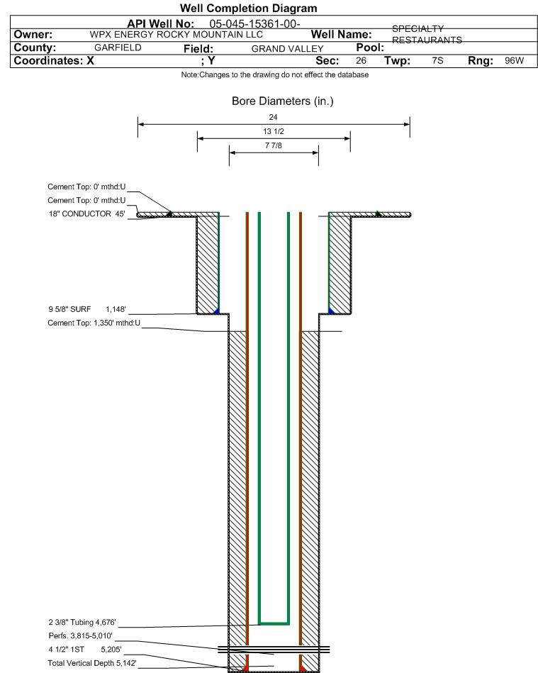 | Wellbore Completed | | Completion Date: | 4/23/2008 | | Spud Date: | 4/17/2008 | Spud Date Is: | ACTUAL | | Measured TD: | 5217 ft. | Measured PB depth: | 5178 ft. | | True Vertical TD: | 5142 ft. | True Vertical PB depth: | 5103 ft. | | Top PZ Location: | Sec:26 Twp: 7S 96W | Footage: 1888 FNL 805 FWL | | Bottom Hole Location: | Sec:26 Twp: 7S 96W | Footage: 1888 FNL 805 FWL | | Log Types: | CBL; RMTE; MUD | | Casing: | String Type: CONDUCTOR, Hole Size: 24 in., Size: 18 in., Top: 0 ft., Depth: 45 ft., Weight: , Citings Type: ACTUAL | | Cement: | Sacks: 25, Top: 0 ft., Bottom: 45 ft., Determination Method: | | Casing: | String Type: SURF, Hole Size: 13.5 in., Size: 9.625 in., Top: 0 ft., Depth: 1148 ft., Weight: , Citings Type: ACTUAL | | Cement: | Sacks: 315, Top: 0 ft., Bottom: 1148 ft., Determination Method: | | Casing: | String Type: 1ST, Hole Size: 7.875 in., Size: 4.5 in., Top: 0 ft., Depth: 5205 ft., Weight: , Citings Type: ACTUAL | | Cement: | Sacks: 711, Top: 1350 ft., Bottom: 5205 ft., Determination Method: CBL | | Formation | Interval Top | Log Bottom | Cored | DSTs | | WASATCH G | 620 ft. | | N | N | | MESAVERDE | 2243 ft. | | N | N | | CAMEO | 4593 ft. | | N | N | | ROLLINS | 5076 ft. | | N | N |