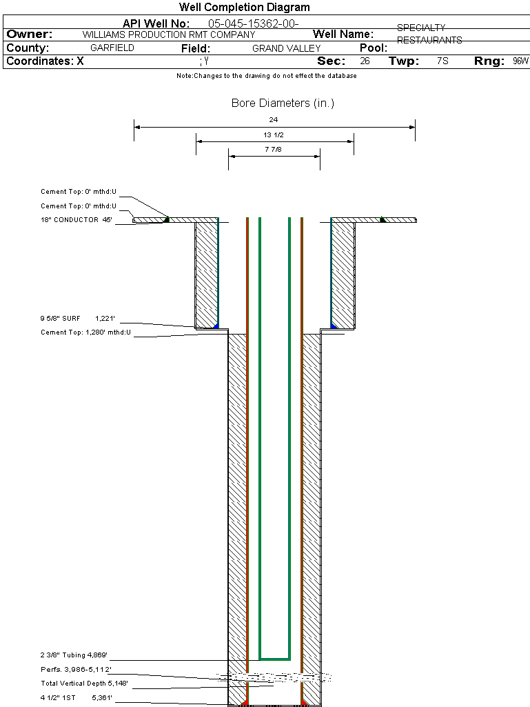 | Wellbore Completed | | Completion Date: | 4/9/2008 | | Spud Date: | 4/2/2008 | Spud Date Is: | ACTUAL | | Measured TD: | 5367 ft. | Measured PB depth: | 5334 ft. | | True Vertical TD: | 5148 ft. | True Vertical PB depth: | 5115 ft. | | Top PZ Location: | Sec:26 Twp: 7S 96W | Footage: 1254 FNL 821 FWL | | Bottom Hole Location: | Sec:26 Twp: 7S 96W | Footage: 1254 FNL 821 FWL | | Log Types: | CBL, RESIST/DENS/NEU, MUD | | Casing: | String Type: CONDUCTOR, Hole Size: 24 in., Size: 18 in., Top: 0 ft., Depth: 45 ft., Weight: , Citings Type: ACTUAL | | Cement: | Sacks: 25, Top: 0 ft., Bottom: 45 ft., Determination Method: CALC | | Casing: | String Type: SURF, Hole Size: 13.5 in., Size: 9.625 in., Top: 0 ft., Depth: 1221 ft., Weight: , Citings Type: ACTUAL | | Cement: | Sacks: 380, Top: , Bottom: 1220 ft., Determination Method: CALC | | Casing: | String Type: 1ST, Hole Size: 7.875 in., Size: 4.5 in., Top: 0 ft., Depth: 5361 ft., Weight: , Citings Type: ACTUAL | | Cement: | Sacks: 725, Top: 1280 ft., Bottom: 5360 ft., Determination Method: CBL | | Formation | Interval Top | Log Bottom | Cored | DSTs | | WASATCH G | 617 ft. | | N | N | | MESAVERDE | 2354 ft. | | N | N | | CAMEO | 4751 ft. | | N | N | | ROLLINS | 5263 ft. | | N | N |