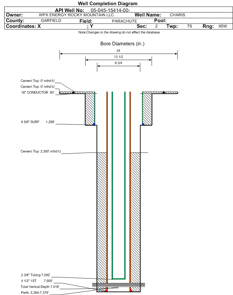 Wellbore #00 Wellbore Classification: GW Status: PR - 4/16/2011 Measured TD: 7575 ft. Vertical TD: 7418 ft.| Wellbore Data for Original Wellbore | Wellbore Classification: GW PR - 4/16/2011 | | Wellbore Permit | DIRECTIONAL | | Permit #: | | Expiration Date: | 1/12/2011 | | Proposed Top PZ Location: | Sec:2 Twp: 7S 95W | Footage: 1820 FSL 373 FWL | | Bottom Hole Location: | Sec:2 Twp: 7S 95W | Footage: 1820 FSL 373 FWL | | Proposed Depth/Form: | 7605 ft. | | Surface Mineral Owner Same: | No | | Mineral Owner: | FEE | Surface Owner: | FEE | | Unit: | | Unit Number: | | | Formation And Spacing: | Code: WMFK , Formation: WILLIAMS FORK , Order: 440-46 , Unit Acreage: 320, Drill Unit: W/2 | | Casing: | String Type: CONDUCTOR, Hole Size: 24 in., Size: 18 in., Top: , Depth: 45 ft., Weight: 48 , Citings Type: PLANNED | | Cement: | Sacks: 25, Top: 0 ft., Bottom: 45 ft. | | Casing: | String Type: SURF, Hole Size: 13.5 in., Size: 9.625 in., Top: , Depth: 2111 ft., Weight: 32.3 , Citings Type: PLANNED | | Cement: | Sacks: 737, Top: 0 ft., Bottom: 2111 ft. | | Casing: | String Type: 1ST, Hole Size: 7.875 in., Size: 4.5 in., Top: , Depth: 7605 ft., Weight: 11.6 , Citings Type: PLANNED | | Cement: | Sacks: 591, Top: , Bottom: 7605 ft. |