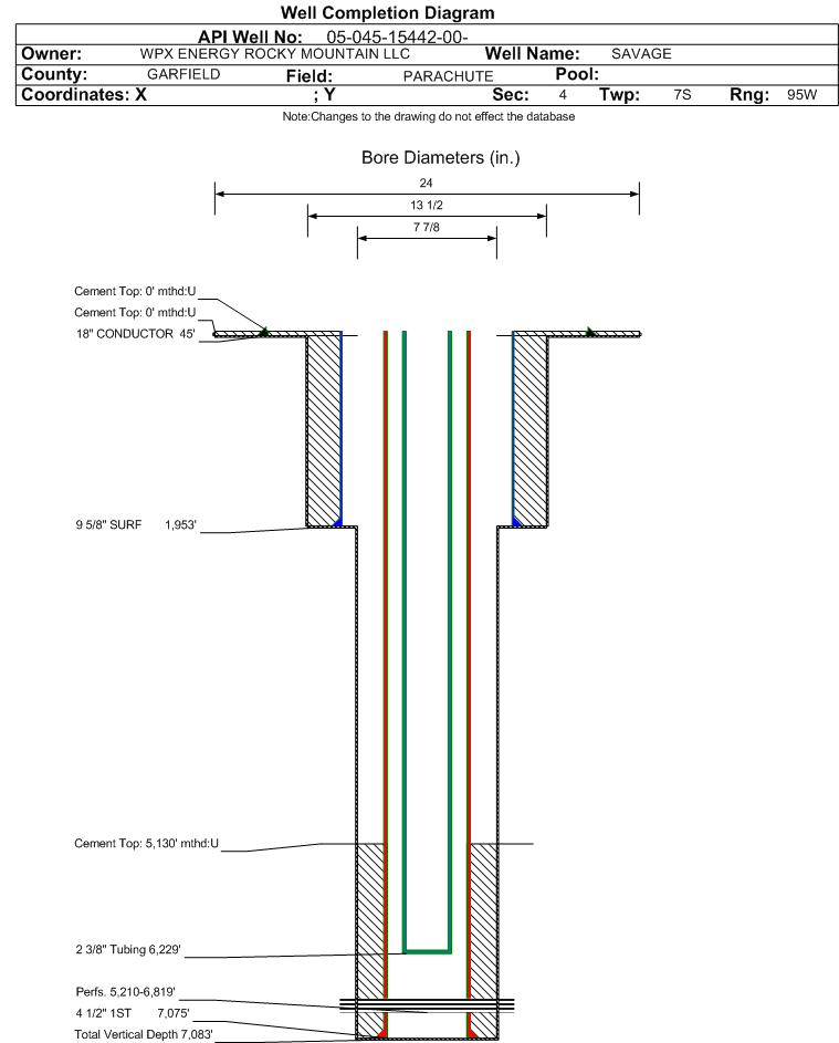 Wellbore #00 Wellbore Classification: GW Status: PR - 8/21/2008 Measured TD: 7095 ft. Vertical TD: 7083 ft.| Wellbore Data for Original Wellbore | Wellbore Classification: GW PR - 8/21/2008 | | Wellbore Permit | DIRECTIONAL | | Permit #: | 200767128 | Expiration Date: | 1/28/2009 | | Proposed Top PZ Location: | Sec: Twp: | Footage: 400 FSL 1997 FEL | | Bottom Hole Location: | Sec:4 Twp: 7S 95W | Footage: 400 FSL 1997 FEL | | Proposed Depth/Form: | 7078 ft. | | Surface Mineral Owner Same: | No | | Mineral Owner: | FEE | Surface Owner: | FEE | | Unit: | | Unit Number: | | | Formation And Spacing: | Code: WMFK , Formation: WILLIAMS FORK , Order: 440-35 , Unit Acreage: 640, Drill Unit: |