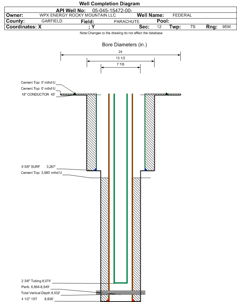 Wellbore #00 Wellbore Classification: GW Status: PR - 11/20/2008 Measured TD: 8845 ft. Vertical TD: 8532 ft.| Wellbore Data for Original Wellbore | Wellbore Classification: GW PR - 11/20/2008 | | Wellbore Permit | DIRECTIONAL | | Permit #: | 20076659 | Expiration Date: | 2/3/2009 | | Proposed Top PZ Location: | Sec: Twp: | Footage: 1122 FNL 1803 FEL | | Bottom Hole Location: | Sec:13 Twp: 7S 95W | Footage: 1122 FNL 1803 FEL | | Proposed Depth/Form: | 8834 ft. | | Surface Mineral Owner Same: | Yes | | Mineral Owner: | FEDERAL | Surface Owner: | FEDERAL | | Unit: | | Unit Number: | | | Formation And Spacing: | Code: WMFK , Formation: WILLIAMS FORK , Order: 139-64 , Unit Acreage: 640, Drill Unit: |