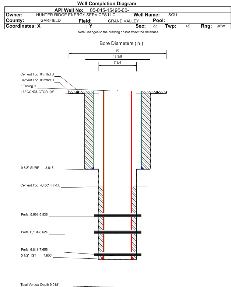 Wellbore #00 Wellbore Classification: DSPW Status: SI - 11/1/2025 Measured TD: 9253 ft. Vertical TD: 9048 ft.| Wellbore Data for Original Wellbore | Wellbore Classification: DSPW SI - 11/1/2025 | | Wellbore Permit | DIRECTIONAL | | Permit #: | 20076993 | Expiration Date: | 2/11/2009 | | Proposed Top PZ Location: | Sec:27 Twp: 4S 96W | Footage: 63 FNL 265 FEL | | Bottom Hole Location: | Sec:27 Twp: 4S 96W | Footage: 63 FNL 265 FEL | | Proposed Depth/Form: | 11905 ft. | | Surface Mineral Owner Same: | No | | Mineral Owner: | FEDERAL | Surface Owner: | FEE | | Unit: | STORY GULCH UNI | Unit Number: | COC-69333X | | Formation And Spacing: | Code: WMFK , Formation: WILLIAMS FORK , Order: , Unit Acreage: , Drill Unit: | | Casing: | String Type: 2ND, Hole Size: 6.125 in., Size: 4.5 in., Top: , Depth: 11905 ft., Weight: 13.5 , Citings Type: PLANNED | | Cement: | Sacks: 270, Top: 8095 ft., Bottom: 11905 ft. |