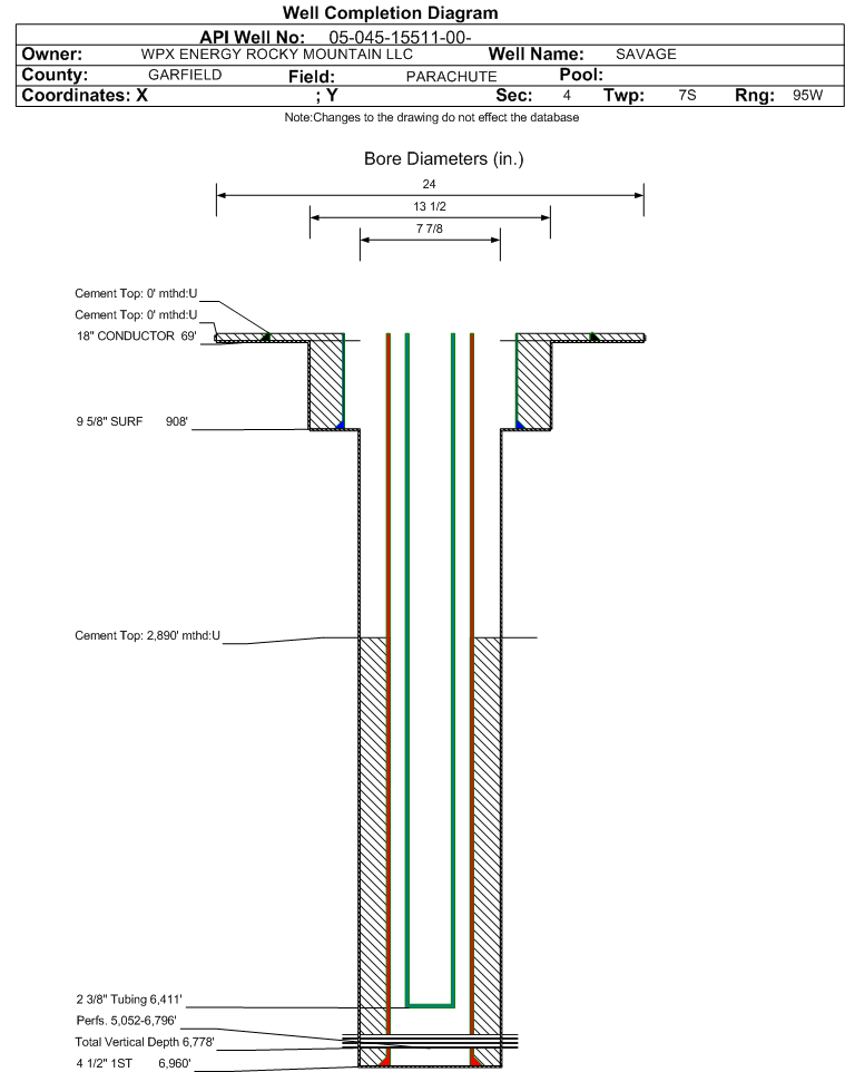 Wellbore #00 Wellbore Classification: GW Status: PR - 2/28/2010 Measured TD: 6980 ft. Vertical TD: 6778 ft.| Wellbore Data for Original Wellbore | Wellbore Classification: GW PR - 2/28/2010 | | Wellbore Permit | DIRECTIONAL | | Permit #: | 20077036 | Expiration Date: | 2/13/2009 | | Proposed Top PZ Location: | Sec: Twp: | Footage: 1510 FSL 164 FWL | | Bottom Hole Location: | Sec:4 Twp: 7S 95W | Footage: 1510 FSL 164 FWL | | Proposed Depth/Form: | 7064 ft. | | Surface Mineral Owner Same: | Yes | | Mineral Owner: | FEE | Surface Owner: | FEE | | Unit: | | Unit Number: | | | Formation And Spacing: | Code: WMFK , Formation: WILLIAMS FORK , Order: 440-35 , Unit Acreage: 640, Drill Unit: ALL | | Casing: | String Type: CONDUCTOR, Hole Size: 24 in., Size: 18 in., Top: , Depth: 45 ft., Weight: 48 , Citings Type: PLANNED | | Cement: | Sacks: 25, Top: 0 ft., Bottom: 45 ft. | | Casing: | String Type: SURF, Hole Size: 13.5 in., Size: 9.625 in., Top: , Depth: 1910 ft., Weight: 32.3 , Citings Type: PLANNED | | Cement: | Sacks: , Top: 0 ft., Bottom: 1910 ft. | | Casing: | String Type: 1ST, Hole Size: 7.875 in., Size: 4.5 in., Top: , Depth: 7064 ft., Weight: 11.6 , Citings Type: PLANNED | | Cement: | Sacks: , Top: , Bottom: |