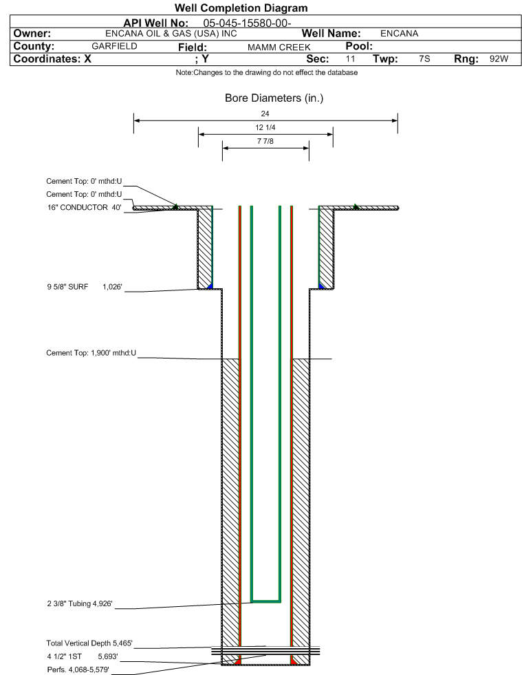 | Wellbore Completed | | Completion Date: | 11/23/2008 | | Spud Date: | 10/13/2008 | Spud Date Is: | ACTUAL | | Measured TD: | 5693 ft. | Measured PB depth: | 5649 ft. | | True Vertical TD: | 5465 ft. | True Vertical PB depth: | 5421 ft. | | Top PZ Location: | Sec:11 Twp: 7S 92W | Footage: 2641 FNL 654 FWL | | Bottom Hole Location: | Sec:11 Twp: 7S 92W | Footage: 2641 FNL 654 FWL | | Log Types: | CBL, RST | | Casing: | String Type: CONDUCTOR, Hole Size: 24 in., Size: 16 in., Top: 0 ft., Depth: 40 ft., Weight: , Citings Type: ACTUAL | | Cement: | Sacks: 100, Top: 0 ft., Bottom: 40 ft., Determination Method: CALC | | Casing: | String Type: SURF, Hole Size: 12.25 in., Size: 9.625 in., Top: 0 ft., Depth: 1026 ft., Weight: , Citings Type: ACTUAL | | Cement: | Sacks: 100, Top: 0 ft., Bottom: 1026 ft., Determination Method: CALC | | Casing: | String Type: 1ST, Hole Size: 7.875 in., Size: 4.5 in., Top: 0 ft., Depth: 5693 ft., Weight: , Citings Type: ACTUAL | | Cement: | Sacks: 1387, Top: 1900 ft., Bottom: 5693 ft., Determination Method: CBL | | Formation | Interval Top | Log Bottom | Cored | DSTs | | WASATCH | 0 ft. | 3157 ft. | N | N | | WILLIAMS FORK | 3157 ft. | 5693 ft. | N | N |